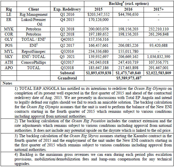 Ocean Rig Poseidon George Economou, Ocean Rig’s Chairman and CEO commented: “We are pleased to extend our relationship with ENI. This transaction is the natural consequence of the good cooperation, performance and flexibility shown by both parties to enter into a mutually beneficial arrangement. Assuming the consummation of this agreement, Ocean Rig’s revenue backlog now stands at approximately $5.4 billion which provides us with the necessary flexibility to navigate the more challenging markets in 2015.” Fleet Employment Update as of 31 December, 2014