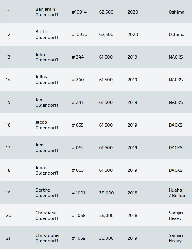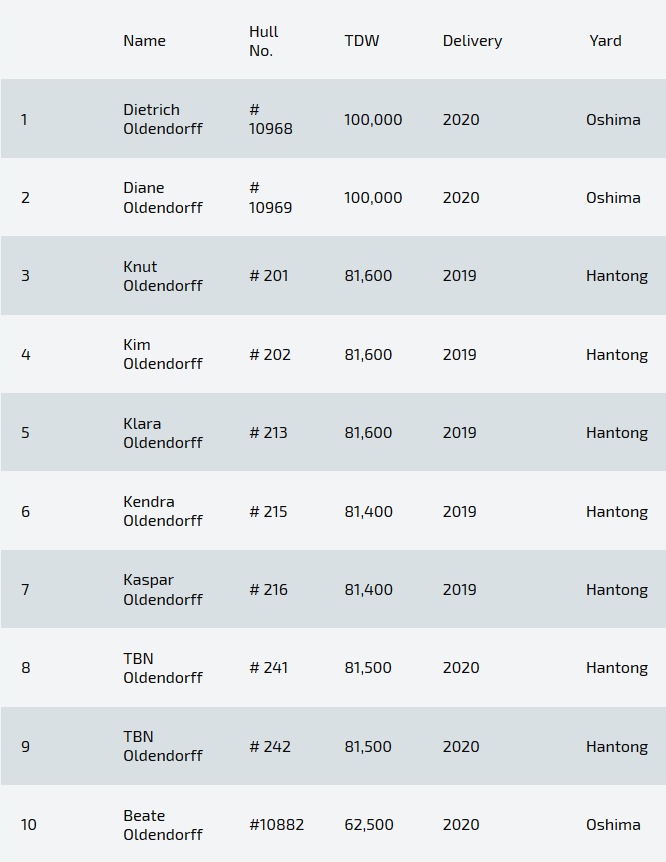 25th June 2018 The recent declaration of two Kamsarmax newbuilding options has increased our orderbook: Between end 2018 and mid-2020, OLDENDORFF CARRIERS will receive another 21 “eco” bulk carrier newbuildings from yards in Japan and China, which were mostly ordered between 2015 and 2017 at historically attractive prices. OSHIMA Shipbuilding will deliver 2 x 100,000 tdw Post-panamaxes and 3 x 62,000 tdw Ultramaxes during the first half of 2020. The Oshima designs are setting new benchmarks in terms of low fuel consumption. HANTONG Ship Heavy Industry will build 7 x 82,000 tdw “Sdari” design Kamsarmaxes between 2019 and spring 2020, two of which will have ice class 1c. The series will feature “MAN-B&W” engines imported from Korea, “Yanmar” auxiliary engines imported from Japan and optimized “Nakashima” propellers. The latest two ships at Hantong were options, which were declared earlier this month. The total number of vessels ordered at Hantong was 10, but 3 ships were later resold to other owners. NACKS (Cosco / Kawasaki JV yard in Nantong) and DACKS (the sister yard in Dalian) will build 6 x 61,000 tdw Ultramax bulk carriers for us to a high specification, which will all deliver next year. Finally, we will receive 3 x 36,000 / 38,000 tdw Handysize vessels from two Chinese yards in 2018 and 2019. Last month, we agreed to sell 13 Ultramax vessels for delivery until September 2018 to an Asian buyer with 2 years time charter back, based on a floating rate structure. The package contains 8 x 63,500 tdw bulk carriers built at Qingshan and Yangzijiang (built 2015 – 2018) and 5 x 61,000 tdw Ultramaxes built at Imabari and NACKS (all built in 2014).