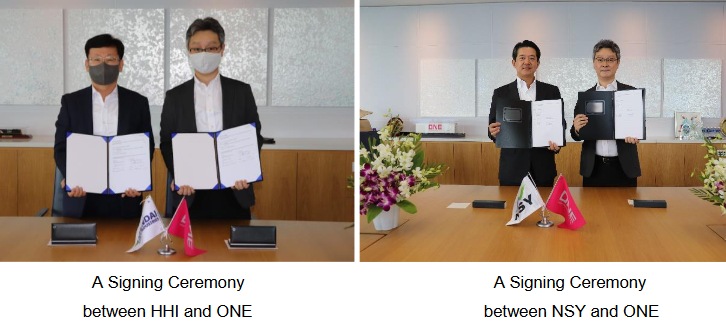 ONE announces signing of Ship Building Contracts for Ten Very Large Container Ships Singapore - May 31st, 2022 Ocean Network Express Pte. Ltd. has signed ship building contracts with both Hyundai Heavy Industries Co. Ltd. and Nihon Shipyard Co., Ltd. to construct 5 vessels each, adding a total of ten modern Very Large Container Ships (VLCS) to ONE's fleet. These ships have a nominal capacity of more than 13,700TEU and are to be delivered in 2025. This investment embodies ONE's Midterm Strategy announced in March, to safeguard a sustainable supply chain for the future and underscore ONE's green strategy and decarbonization plan. The vessels are designed with the highest efficiency standards as well as a variety of cutting-edge technology to reduce navigational impacts to the environment and are planned for the "Ready notation" or "AiP (Approval in Principle)" of Ammonia and Methanol as fuel, Carbon Capture and Storage. Moreover, this fleet will enable ONE to broaden the exploration of long-term alternative fuels and decarbonization technologies in the future. ONE is determined to become a leader in maritime decarbonization and remains fully committed to achieving sustainable marine transportation by achieving carbon neutrality by 2050. The company will continue to make necessary investments in greener assets and technologies, whilst engaging in open collaboration with industry stakeholders.