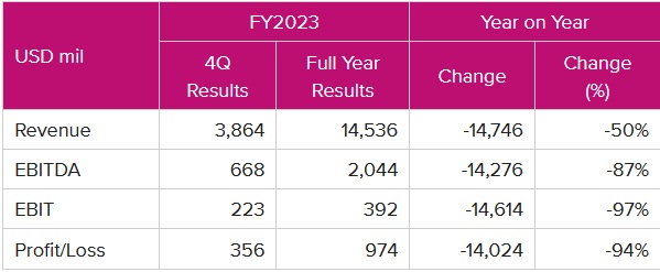 Ocean Network Express released Financial Result for FY2023 Singapore, 30 April, 2024 Ocean Network Express (ONE) released the Financial Result for FY2023 (from Apr 2023 to Mar 2024). The revenue for FY2023 was US$14,536million, down 50% from the last year, with net profit of US$974million (YoY -US$14,024million). The short-term freight rate market continued to decline due to sluggish cargo movements and pressure from supply side as new vessel deliveries continued. However, freight rates rose due to geopolitical uncertainty surrounding the situation in the Middle East in 4Q.