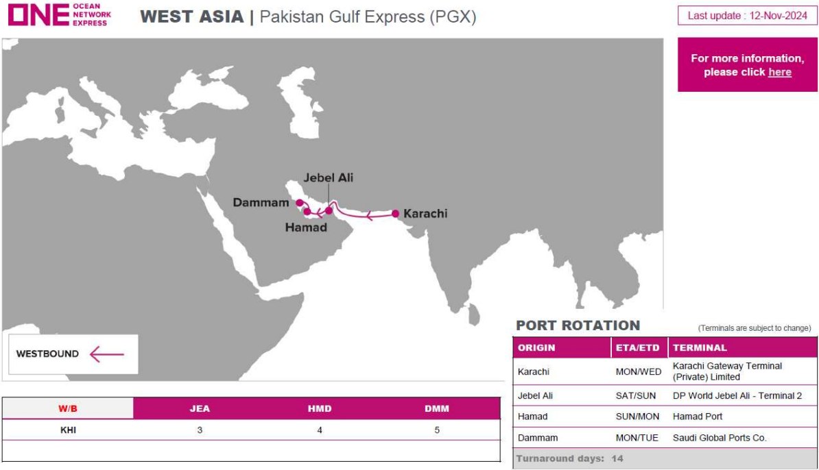 New service launch connecting Pakistan and the Middle East Nov 14, 2024 Ocean Network Express is delighted to announce the launch of our new weekly service - "Pakistan Gulf Express (PGX)" - connecting Karachi to Jebel Ali, Hamad and Dammam. The introduction of the new PGX service will undoubtedly expand ONE's service offerings and enhance our overall network in the Arabian Sea. New Service details are as follows. PGX Karachi - Jebel Ali - Hamad - Dammam Effective voyage - MV ADDISON V.W016 with ETA Karachi 02nd Dec 2024 ONE continues its best efforts in offering comprehensive coverage and greater service quality to customers as "Your Number ONE Shipping Partner".