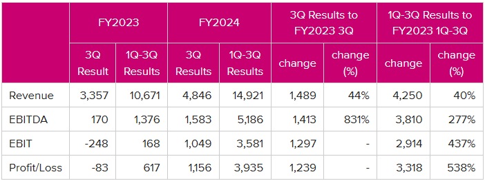 Financial Results for FY2024 3rd Quarter Ocean Network Express released Financial Result for FY2024 3rd Quarter Singapore, 31 January 2025 Ocean Network Express (ONE) released the financial result for FY2024 3rd Quarter (from October 2024 to December 2024). The revenue for FY2024 3rd quarter was US$4,846million, up 44% from the same quarter of the last year, with net profit of US$1,156million (YoY +US$1,239million). The Asia-North America trade saw stable cargo movement driven by strong consumer spending, in addition to concern about the labor negotiations in the East Coast and Gulf ports. The Asia-Europe trade also experienced strong cargo movement.
