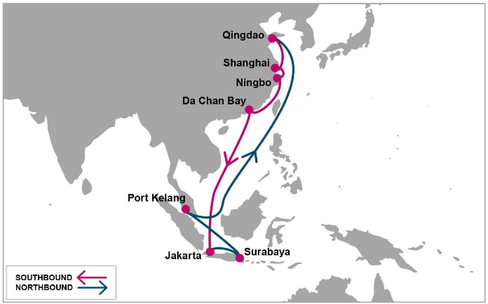 The CIM2 service starts with OOCL's MV Savanna V403S/N departing form Qingdao. The CIM2 service rotation is as follows: Qingdao - Shanghai - Ningbo - Da Chan Bay - Jakarta - Surabaya - Port Kelang - Qingdao.