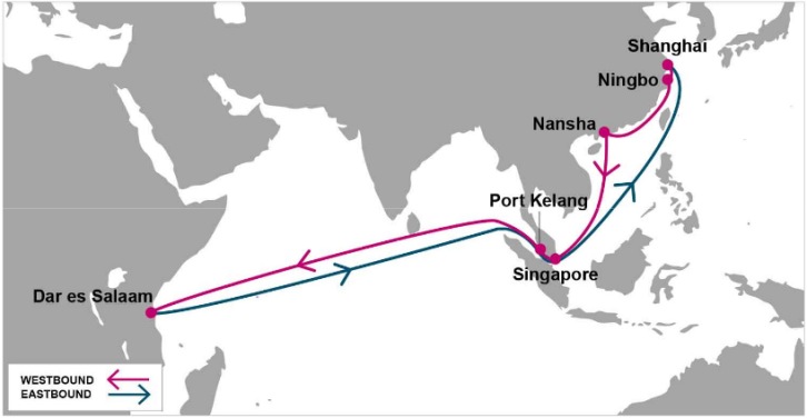 Image by Ocean Network Express Pte. Ltd. EA4 Shanghai - Ningbo - Nansha - Singapore - Port Kelang - Dar Es Salaam - Port Kelang - Singapore - Shanghai (Weekly frequency)