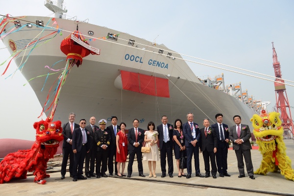 August 26, 2015 At a christening ceremony held on Changxing Island in Shanghai today, OOCL celebrated the naming of the latest 8,888 TEU containership that will be joining the company’s fleet this year. In front of many honorable guests and institutional supporters, the OOCL Genoa was named by Vessel Sponsor Mrs. Tamiko Onaka at the newest shipyard of Hudong-Zhonghua Shipbuilding (Group) Co., offering blessings to the ship and her crew when she begins serving the OOCL South China 2 service, linking two of the world’s largest economies today. Among other distinguished guests was the Sponsor’s husband, Mr. Koichi Onaka, Managing Executive Officer of Sumitomo Mitsui Trust Bank, as our Guest of Honor, and Mr. Hisanaga Tanimura, President and Chief Executive Officer of Financial Products Group who also joined the celebration to welcome the OOCL Genoa.