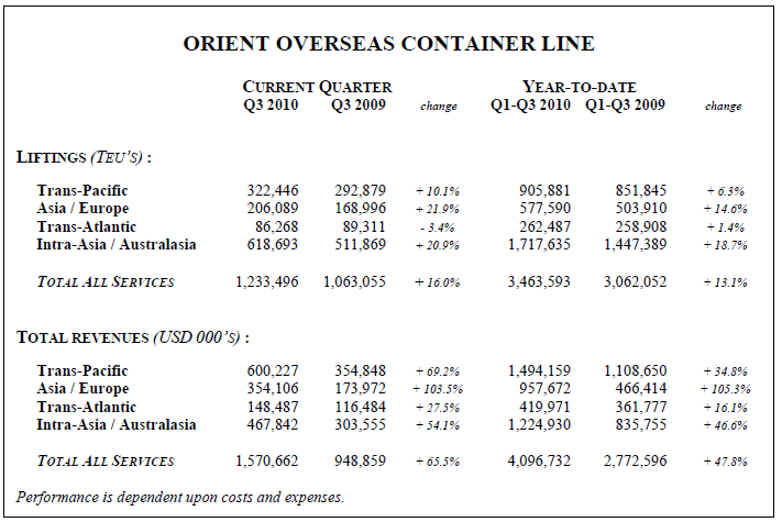 For the third quarter of 2010 (ended 30th September 2010), total volumes were 16.0% up on the same period last year. Total revenues increased by 65.5% to US Dollars 1,570.7 million. With a 10.4% increase in loadable capacity, the overall load factor was 3.9% better than the same period in 2009. Overall average revenue per teu increased by 42.6% compared to the third quarter of last year. For the first nine months of 2010 (ended 30th September 2010), total volumes increased by 13.1% over the same period last year and total revenues recorded a 47.8% increase. Loadable capacity decreased by 1.1%, and the overall load factor was 10.2% higher than the corresponding period in 2009. Overall average revenue per teu increased by 30.7% compared to the same period last year.