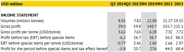 Third quarter 2014 highlights: 1 July - 30 September 2014 • Due to the slide in oil price, in particular in September, risk management resulted in an unrealised loss of USD 24.5 million, USD 2.5 million higher than estimated in Company Announcement 22/2014 on October 7 2014. • Since a jump in the oil price to a 9-month high of above USD 115 (Brent) in the second half of June 2014, the oil price dropped around 20% in Q3 2014 to the lowest level in over two years. This steep fall led to market disruptions in September, and negatively affected the risk management as well as other parts of the business. • The oil price development included a structural change in the oil futures market from backwardation to contango. Backwardation is the predominant market structure, and the sudden structural change in late September had a negative effect on risk management. • Marine fuel transaction volume rose 2% to 8.01 million tonnes (Q3 2013: 7.82 million tonnes). 9M 2014 volume was 22.88 million tonnes against 21.27 million tonnes in the same period 2013, an increase of 8%. Volume growth in the third quarter was below expectations, but satisfactory in a difficult market affected by a steep decline in the oil price. • Gross profit fell to USD 29.0 million (Q3 2013: USD 59.8 million), mainly driven by the unrealised risk management loss of USD 24.5 million. 9M 2014 gross profit was USD 143.7 million against USD 155.7 million in the same period 2013. • Gross profit per tonne fell to 3.62 USD (Q3 2013: USD 7.65 per tonne). Excluding the unrealised risk management loss gross profit per tonne was USD 6.67 in Q3 2014. 9M 2014 gross profit per tonne was USD 6.28 against USD 7.32 in the same period 2013. Excluding the unrealised risk management loss, 9M 2014 gross profit per tonne was USD 7.35. Gross profit includes interest income from trade credit. • Profit before tax (EBT) before special items fell to USD -6.2 million (Q3 2013: USD 26.7 million). 9M 2014 EBT before special items was USD 36.7 million, down from USD 56.5 million in the same period 2013. • Profit for the period before special items and tax effect hereof was USD -5.8 million (Q3 2013: USD 20.7 million). 9M 2014 profit for the period before special items and tax effect hereof was USD 27.6 million against USD 44.0 million in the same period 2013. • Return on equity before special items and tax effect hereof was -10% (Q3 2013: 34%). 9M 2014 return on equity before special items and tax effect hereof was 15% against 24% in 9M 2013. • OW Bunker reduces its expected full-year 2014 volume growth to around 6% compared to 2013 from previously approx. 10% in a move to focus on higher margin business. Company Announcement 22/2014 on October 7, 2014, implied a full-year net profit before special items of approx. USD 55 million. This included a possible reduction of the risk management loss, assuming unchanged or higher oil prices. Excluding the possible reduction of the unrealised risk management loss, net profit before special items is expected around USD 44 million. See further details of the full-year 2014 outlook on page 8. About OW Bunker A/S OW Bunker is a leading global independent marine fuel (bunker) company founded in Denmark in 1980 with operations in 29 countries, including the world's busiest and most important ports. OW Bunker acts as a physical distributor as well as reseller of marine fuel, and operates a global fleet of approx. 30 bunker vessels. OW Bunker also provides advanced risk management solutions aimed at controlling costs, minimising risk and protecting against market fluctuations. Headquartered in Nørresundby, Denmark, OW Bunker is listed on the NASDAQ OMX Copenhagen and has over 600 employees globally. O.W. Bunker press release |