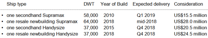 Hong Kong - 14 May 2018 Pacific Basin Shipping Limited (“Pacific Basin” or the “Company”, 2343.HK), one of the world’s leading dry bulk shipping companies, today announced its conditional agreement to acquire four dry bulk vessels for a total consideration of US$ 88.5 million to be 50% funded by equity. The consideration will take the form of: 1) 170,760,137 new Pacific Basin shares (the “new shares”) to be issued to the ships’ sellers amounting to US$ 44.29 million in aggregate; and 2) US$44.21 million to be funded from the Group’s cash. The acquisition of the ships and the share issue are all conditional upon the Hong Kong Stock Exchange’s approval of the listing of the new shares, which we expect to be granted within several days. The acquisitions relate to: