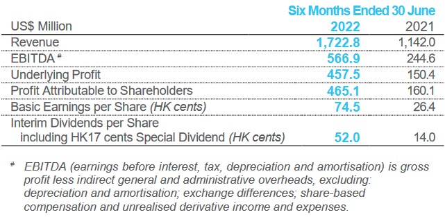 We generated our best interim results ever of US$465.1 million net profit The Board has declared an interim basic dividend of HK35 cents per share and an additional special dividend of HK17 cents per share Handysize and Supramax TCE earnings increased 83% and 85% respectively, compared to the same period in 2021 Healthy dry bulk market, our strong cash generation and limited expected capital expenditure will enable us to continue to reward shareholders Hong Kong, 28 July 2022 Pacific Basin Shipping Limited (“Pacific Basin” or the “Company”, 2343.HK), one of the world's leading dry bulk shipping companies, today announced the results of the Company and its subsidiaries (collectively the “Group”) for the six months ended 30 June 2022. Mr. Martin Fruergaard, CEO of Pacific Basin, said: "In the first half of 2022, we generated our best interim results ever, producing an underlying profit of US$457.5 million, a net profit of US$465.1 million and an EBITDA of US$566.9 million. This yielded an exceptionally strong return on equity of 48%, with basic EPS of HK74.5 cents. Our results benefited from significantly higher average TCE earnings compared to the same period last year, strong operating activity results, and a competitive cost structure. We continued to significantly outperform the market index rates, especially in our Supramax business, which delivered an exceptional performance over the period. Global minor bulk loading volume grew approximately 9% in the first half compared to the same period last year. Construction materials were the main driver, in particular cement, clinker and aggregates where loadings were up 8% year on year. On the other hand, the global dry bulk fleet grew only 1.5% net during the half-year compared to 1.9% in the same period last year mainly due to slowing newbuilding deliveries. The global fleet of Handysize and Supramax vessels grew by 1.6%, which despite slowing global economic growth has helped to support higher rates over the period. Our core business generated average Handysize and Supramax daily time-charter equivalent earnings of US$26,370 and US$33,840 net per day in the first half, representing an increase of 83% and 85% compared to the same period in 2021, respectively. Our performance continues to benefit from our diverse cargo and customer base and the close customer interaction facilitated by our extensive global office network. Our operating activity contributed US$30.7 million, generating a margin of US$3,330 net per day over 9,200 operating days in the first half. While margins varied over the period, they still remain historically high. Our financial position continues to strengthen with available committed liquidity of US$698.6 million and a net cash position of US$68.9 million as at 30 June 2022. In light of the strong earnings, cash position and our confidence in the longer-term outlook for minor bulk shipping, the Board has declared an interim basic dividend of HK35 cents per share, representing 50% of our net profit for the period, and an additional special dividend of HK17 cents per share, representing 25% of our net profit for the period. The basic dividend and the special dividend together amount to a total dividend of HK52 cents per share. Our Fleet