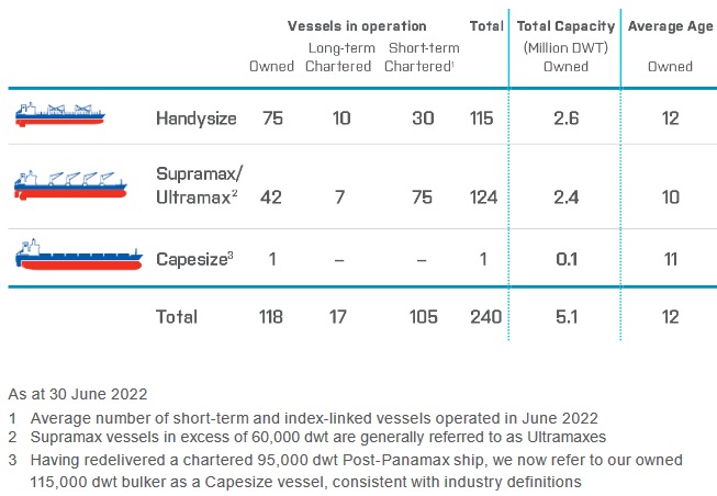 Benefitting from our Fleet Renewal Strategy We remain committed to our long-term strategy to grow our owned fleet of Supramax ships by acquiring high-quality, modern, second-hand vessels, and to sell our older and less-efficient Handysize ships and replace them with younger and larger Handysize vessels. During the period we sold five of our older Handysize ships, while taking delivery of one Ultramax vessel purchased in 2021. This strategy is resulting in an even more efficient fleet with greater longevity, while crystallising value from historically high second-hand prices. We expect our vessel purchasing activity to be less than last year as asset prices have approached historical highs, though we remain opportunistic where we see attractive second-hand acquisition opportunities. We currently own 117 Handysize and Supramax ships and, including chartered ships, we have approximately 240 ships on the water overall. Market Outlook In light of a softening global economy, we expect dry bulk demand in the second half to moderate somewhat from recent highs but remain relatively firm mainly due to seasonal factors in the grain market, elevated coal demand for electricity production and continued investment in global infrastructure. Any revival of the Chinese economy is expected to be supported by domestic property construction, manufacturing and infrastructure spending as government policies are needed to drive growth in light of continuing Covid restrictions. Changes in trade flows caused by the conflict in Ukraine have positively impacted tonne-mile demand for some commodities to date, but we continue to monitor the impact that the conflict might have as we come close to the typical Black Sea grain export season. Supply is still tied up in congestion around the world, and although vessel speeds remain elevated leaving limited scope to increase vessel capacity through higher speed, historically very high bunker costs have begun to lower speeds taking some supply out of the market. We believe uncertainty over new environmental regulations and the high cost of newbuildings, will continue to discourage any significant new ship ordering. According to Clarksons Research, current orderbook is at a 30-year low of just 7.2% of total fleet and new ordering is down 60% in the first half of 2022 compared to the same period last year. The low orderbook coupled with IMO regulations to reduce carbon intensity likely resulting in slower speeds and increased scrapping from 2024 onwards, bodes well for the long-term health of the dry bulk market. Well Positioned for the Future Given the supportive fundamentals of our industry we are excited by the long-term prospects of dry bulk shipping despite any short-term headwinds. Our large and modern owned fleet of highly versatile Handysize and Supramax ships, combined with our close customer partnerships, enhanced access to cargo opportunities, and high vessel utilisation, enables us to outperform in this strong earnings environment. Having significantly further strengthened our balance sheet in the first half of 2022, we anticipate that the still healthy dry bulk market, our strong cash generation and limited expected capital expenditure will enable us to continue to reward shareholders by returning capital and take advantage of opportunities to grow our fleet going forward.” Financial Highlights