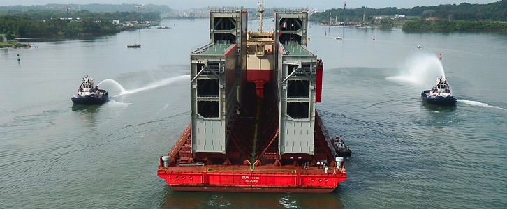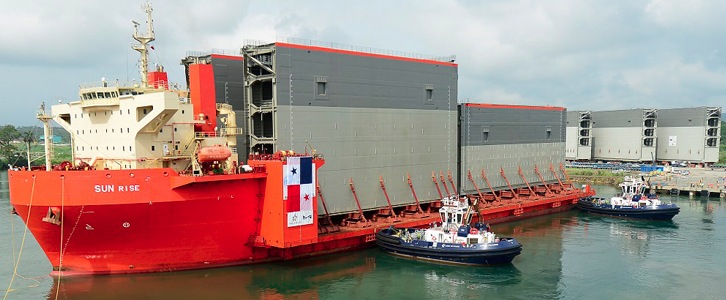 Following a nearly one-month long journey, the ship completed its second trip that began in mid-May in the Port of Trieste, crossing the Mediterranean Sea and the Atlantic Ocean. Differing from the first shipment, these gates have two different dimensions, according to their final position in the lock chambers. The taller ones or "Type C" were fabricated for lock head number 3 in the middle chamber of the Pacific locks. They are 57.6 meters long by 10 meters thick and 31.9 meters tall and weigh approximately 3,900 tons, with all internal appurtenances installed. The shorter ones or "Type A" will be located in lock head 1 in the Atlantic site's upper chamber, adjacent to the lake. They are 57.6 meters long by 8 meters thick and 22.3 meters tall, and weigh approximately 2,300 tons.