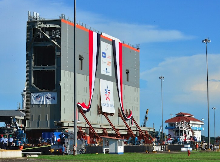 First Gate for the New Locks in the Pacific Transits the Panama Canal Panama City, Panama, October 24, 2014 The first gate for the new locks in the Pacific side began transit Wednesday morning through the Panama Canal, signaling another historic milestone in the progress of the Expansion Program. The gate transits the waterway aboard the Crowley 455-4 barge from the Atlantic temporary dock to the Pacific, assisted by two Panama Canal tugs. It completed its transit through Gatun Locks in the Atlantic this morning. The gate will continue its transit throughout the day, arriving at Pedro Miguel and Miraflores Locks later this afternoon. It will then be transferred to the construction site of the new locks in the Pacific.