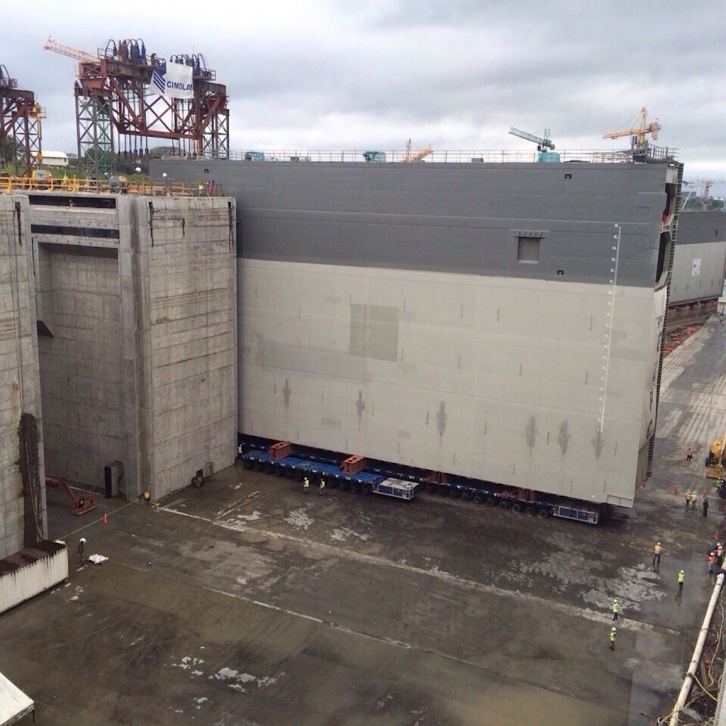 Gate Installation Begins at Panama Canal Expansion Panama City, Panama, December 15, 2014 The installation of the gates for the new locks of the Panama Canal successfully began today on the Atlantic side of the waterway. "This is a very important milestone for the Expansion Program," said Panama Canal Administrator Jorge L. Quijano. "We see how the new locks are rapidly taking shape as we move towards the successful completion of the project." The gate will be located in lock head two in the new locks on the Atlantic side. The installation of the gate began early in the morning and is expected to be completed in the next couple of days. The steel gates are moved using self-propelled motorized wheel transporters (SPMTs) with more than 400 wheels each. The gate currently being installed is 10 meters wide, 30.19 in height and weighs 3,285 tons. In total, the new locks will have 16 rolling gates, eight in the Pacific and eight in the Atlantic. Overall, the Panama Canal Expansion Program is 84 percent complete. About the Panama Canal Authority (ACP) The ACP is the autonomous agency of the Government of Panama in charge of managing, operating and maintaining the Panama Canal. The operation of the ACP is based on its organic law and the regulations approved by its Board of Directors.