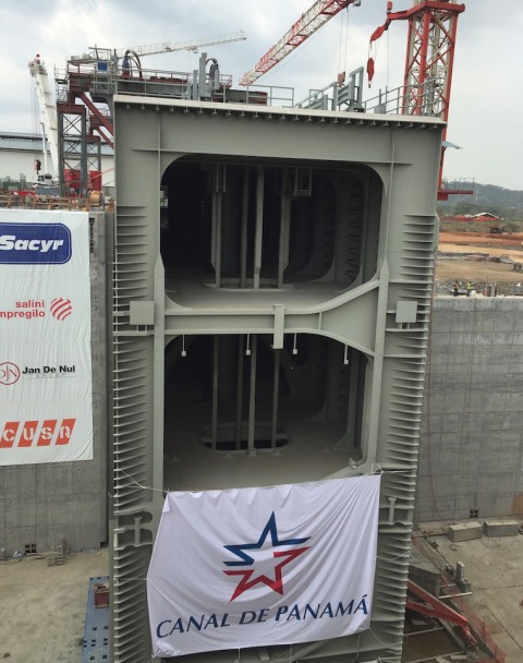 New Toll Structure Reflects Value of the Route and Better Serves Customers Panama City, Panama - April 28, 2015 The Panama Canal Authority (ACP) announced today a key milestone in the Expansion Program, with the installation of the sixteenth and final gate for the new locks on the Pacific side of the Canal. The installation process began at 12:00 PM (Panama Time) on the south end of the Canal's Pacific locks, which connect directly to the ocean. The final gate is one of the heaviest and weighs 4,232 tons, or roughly 8.5 million pounds. It measures 57.6 meters wide by 10 meters long and 33 meters high. "Today's installation is a key milestone in the Expansion Program and another important step forward for the Canal," said Administrator Jorge L. Quijano. "Once finished, the expanded waterway will provide new possibilities for world maritime trade and further position the Canal as a reliable route to the industry." Manufactured in Italy, the new gates first arrived in Panama in four staggered shipments starting in August of 2013. With the installation of the final gate today in the Pacific, another important stage begins with the electro-mechanical work, which connects the gates with the other structures in the new locks. The Panama Canal Expansion recorded an overall advance of 87.6 percent among all its components. With all 16 gates now installed, the next milestone for the expanded Canal will occur when the lock chambers are flooded. The installation of all eight gates on the Atlantic side of the Panama Canal was completed earlier this month on April 1. About the Panama Canal Authority (ACP) The ACP is the autonomous agency of the Government of Panama in charge of managing, operating and maintaining the Panama Canal. The operation of the ACP is based on its organic law and the regulations approved by its Board of Directors. Please refer to the ACP's website: http://www.pancanal.com/ or follow us on Twitter @thepanamacanal. Panama Canal Authority press release |