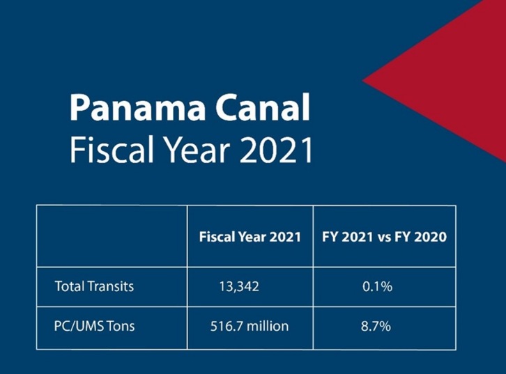 All in all, the Panama Canal recorded a total of 13,342 transits in FY21, driven by an increase in Neopanamax transits. Though their average size increased, Panamax transits declined in total, an anticipated shift accelerated by the impact of the COVID-19 pandemic, as shipping lines consolidated more cargo onto larger ships to decrease frequent transits. To help facilitate this transition, the Panama Canal increased the maximum allowable length (LOA) for vessels transiting the Neopanamax Locks, a move made possible by the waterway’s experience operating the Expanded Canal. The waterway also began offering a 50-foot draft, the highest level allowed at the Neopanamax Locks. Achieved through effective water management and an increase in rainfall, the higher draft ultimately increased the waterway’s capacity to maneuver larger and heavier vessels. Looking Ahead – Securing a Sustainable Future The Panama Canal also advanced its commitments to accelerating the decarbonization of shipping in FY21. In January 2021, the Panama Canal announced the creation of the CO2 Emissions Dashboard, which calculates the carbon dioxide (CO2) emissions saved by vessels that choose to transit the Panama Canal over the most likely alternative route. Building on these and other longstanding efforts, the waterway then committed in April 2021 to becoming carbon neutral by 2030, with plans already underway to invest roughly $2.4 billion in modernizing its equipment and infrastructure to meet this commitment. The Canal will also spend $2.8 billion in maintenance, as well as $500 million in digital transformation initiatives to maximize its capacity and value offered to customers for years to come. The Panama Canal is working on its roadmap outlining the specific steps it will take to reach carbon neutrality by 2030, from generating electricity from renewable sources to migrating the Canal’s fleet to electric vehicles and hybrid tugboats. The Canal will also explore a pricing strategy that promotes the efficiency and low-carbon emissions of the ships that transit the waterway, as well as participate in the upcoming 2021 United Nations Climate Change Conference (COP26) and IMO Marine Environment Protection Committee (MEPC77) meetings. About the Panama Canal The Panama Canal Authority is an autonomous legal entity of the Republic of Panama in charge of the operation, administration, management, preservation, maintenance, and modernization of the Panama Canal, as well as its activities and related services, so that the Canal may operate in a safe, continuous, efficient manner. For more information, please refer to the Canal's website: http://www.pancanal.com or follow us on twitter @thepanamacanal. Panama Canal Authority press release