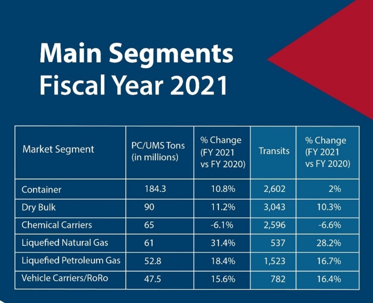 Containers led in total tonnage, while LNG, LPG, vehicle carriers and dry bulkers drove overall growth, leading to strong results for FY21 amid continued supply chain disruptions and a transition to sustainable shipping Panama City, Panama - October 28, 2021 The Panama Canal closed its fiscal year 2021 (FY21) with a record-breaking annual tonnage of 516.7 million Panama Canal tons (PC/UMS), coming in 8.7% higher compared to the 2020 fiscal year (FY20) and 10% above tonnage registered in FY19, the waterway’s last pre-pandemic fiscal year. “I am grateful for and proud of our world-class workforce, whose resilience and dedication allowed us, throughout the pandemic, to continue providing a service of excellence and enabling the uninterrupted delivery of essential goods around the world,” said Panama Canal Administrator Ricaurte Vásquez Morales. “This commitment was key in our ability to manage a record tonnage, which reinforces the Expanded Canal’s value to global trade after five years of successful operations.” FY21 Performance in Detail Fiscal year 2021 was marked by unprecedented supply chain challenges caused by the continued impact of the COVID-19 pandemic. Related disruptions drove container rates to rise exponentially and production to slow down across various sectors, due to raw material shortages. Amid this landscape, the Panama Canal saw traffic grow between October 1, 2020 and September 30, 2021, driven by liquefied natural gas (LNG), liquefied petroleum gas (LPG), containerships, dry bulkers, and vehicle carriers.