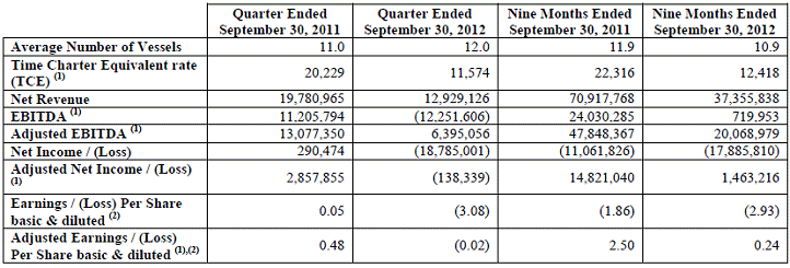 (2) Adjusted to give effect to the 1 to 10 reverse stock split that became effective on November 5, 2012. Time Charter Coverage Update Pursuant to its time chartering strategy, the Company mainly employs vessels under fixed rate time charters for periods ranging from one to five years. Assuming all charter counterparties fully perform under the terms of the charters, based on the earliest redelivery dates and including our newbuilding vessels, the Company has secured employment for 79%, 55% and 7% of its fleet capacity for the remainder of 2012, 2013 and 2014, respectively. Management Commentary Commenting on the results, Michael Bodouroglou, Chairman and Chief Executive Officer of Paragon Shipping, stated, “For the third quarter of 2012, we reported Adjusted EBITDA of $6.4 million and Adjusted Net Loss of $0.1 million, or $0.02 per share. On average, we operated 12.0 vessels, with our utilization rate being more than 99%. Unfortunately, our results continue to be negatively impacted by the defaults of KLC and Deiulemar, along with the renewals of some of our legacy time charters at prevailing charter rates that are below breakeven levels, a situation that we expect to continue through 2014. However, in an effort to cushion ourselves from the full impact of this downturn, we have been proactive in fixing employment for our vessels and currently have 79% and 55% of our revenue days fixed for the remainder of 2012 and for 2013, respectively.” Mr. Bodouroglou continued, “In order to conserve cash and avoid taking delivery of our remaining four newbuilding vessels in the midst of this market downturn, we have agreed with the shipyard to reschedule the deliveries of the two remaining Handysize drybulk carriers and the two 4,800 TEU Containerships. As a result, we expect to take delivery of the two Handysize vessels in the first and fourth quarters of 2013, and the two Containerships in the second quarter of 2014. We are also in close discussions with our lenders to obtain waivers of certain covenants in our loan agreements and, in some cases, reduce our repayment profiles and ensure that we continue to remain current on all our obligations during the prevailing negative market conditions. ” Mr. Bodouroglou concluded, “We are optimistic that our proactive approach to addressing the consequences of this severe and protracted market downturn should allow us to address all actual and potential challenges and enable our Company to emerge stronger when the market turns, which it inevitably will.” Third Quarter 2012 Financial Results Gross time charter revenue for the third quarter of 2012 was $13.7 million, compared to $21.0 million for the third quarter of 2011. The Company reported net loss of $18.8 million, or $3.08 per basic and diluted share, for the third quarter of 2012, calculated on 5,960,610 weighted average number of basic and diluted shares outstanding for the period and reflecting the impact of the non-cash items discussed below. For the third quarter of 2011, the Company reported net income of $0.3 million, or $0.05 per basic and diluted share, calculated on 5,851,268 weighted average number of basic and diluted shares. Excluding all non-cash items described below, adjusted net loss for the third quarter of 2012 was $0.1 million, or $0.02 per basic and diluted share, compared to adjusted net income of $2.9 million, or $0.48 per basic and diluted share, for the third quarter of 2011. EBITDA for the third quarter of 2012 was negative $12.3 million, compared to positive $11.2 million for the third quarter of 2011. EBITDA for the third quarter of 2012 was calculated by adding to net loss of $18.8 million, net interest expense and depreciation that, in the aggregate, amounted to $6.5 million. Adjusted EBITDA, excluding all non-cash items described below, was $6.4 million for the third quarter of 2012, compared to $13.1 million for the third quarter of 2011. The Company operated an average of 12.0 vessels during the third quarter of 2012, earning an average TCE rate of $11,574 per day, compared to an average of 11.0 vessels during the third quarter of 2011, earning an average TCE rate of $20,229 per day. Total adjusted operating expenses for the third quarter of 2012 equaled $7.5 million, or approximately $6,832 per day per vessel, including vessel operating expenses, management fees, general and administrative expenses and drydocking costs, but excluding $0.8 million of share-based compensation for the period. For the third quarter of 2011, total adjusted operating expenses were $7.3 million, or approximately $7,196 per day per vessel, including the same items as mentioned above, but excluding $1.1 million of share-based compensation. As of September 30, 2012, the Company owned approximately 16.7% of the outstanding common stock of Box Ships Inc. (NYSE:TEU) (“Box Ships”), a former wholly-owned subsidiary of the Company which successfully completed its initial public offering in April 2011. The investment in Box Ships, an affiliate, is accounted for under the equity method and is separately reflected on Company’s unaudited condensed consolidated balance sheet. For the third quarter of 2012, the Company recorded income of $0.5 million, representing its share of Box Ships’ net income for the period, compared to $1.1 million for the third quarter of 2011. In the third quarter of 2012, we received a cash amount of $0.9 million, representing dividend distributions from Box Ships, compared to $0.5 million received in the third quarter of 2011. In the third quarter of 2012, the Company recorded a non-cash loss of $2.9 million relating to the dilution effect from the Company’s non-participation in the public offering by Box Ships of 4,285,715 of Box Ships’ common shares, which was completed on July 18, 2012. In addition, the difference between the fair value and the book value of the Company’s investment in Box Ships was considered to be other than temporary and therefore,