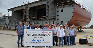 April 30, 2019 Executives from Hawaii-based Pasha Hawaii and Keppel AmFELS were joined by dignitaries today for the ceremonial keel laying for M/V George III and the cutting of the first steel plates for M/V Janet Marie. The two Liquefied Natural Gas (“LNG”) fueled containerships are currently being built at Brownsville, TX-based Keppel AmFELS. Upon completion, both 774-foot U.S. Jones Act vessels will join Pasha Hawaii’s fleet, serving the Hawaii/Mainland trade lane. Delivery of the ‘Ohana Class vessels—named in honor of the late parents of The Pasha Group President and CEO George Pasha, IV—is expected in 2020. “Construction of the new vessels continues to progress on schedule,” said George Pasha, IV. “These LNG-powered containerships were designed to support the needs of shippers in the Hawaii trade lane, while minimizing environmental impact in the communities we serve. Adding George III and Janet Marie to our existing fleet will greatly enhance our service capabilities and on-time delivery, marking three generations of service to Hawaii.” The new vessels will operate fully on LNG from day one in service, substantially improving the vessels’ environmental footprint. Energy savings will also be achieved with a state-of-the-art engine, an optimized hull form, and an underwater propulsion system with a high-efficiency rudder and propeller. “We are pleased to be able to support the Pasha Hawaii fleet with the design, engineering, and construction of the two new dual-fuel LNG containerships," said Simon Lee, President of Keppel AmFELS. "Texas currently ranks third in the nation for domestic maritime jobs, and we are proud to support a thriving skilled workforce in our local community as a leading shipyard in the region. Our team will continue to execute this project safely and efficiently.” “The Maritime Administration supports the U.S maritime industry’s investment in the future by building Jones Act-compliant ships that run on cleaner-burning liquid natural gas (LNG),” said Richard Balzano, Deputy Maritime Administrator. “In addition, U.S.-built, U.S.-owned and U.S.-crewed ships support America’s national and economic security. With LNG, the industry is also leaping over future regulatory barriers, responding to environmental challenges, and looking toward a more affordable and plentiful fuel.” “Today’s construction milestones at Keppel AmFELS are real evidence of the capability we have at shipyards across the U.S. to build any kind of ship,” said Matt Woodruff, Chairman of the American Maritime Partnership. “These Jones Act ships being built at Keppel will be amongst the most modern, fuel-efficient containerships in the world, and are living and breathing proof that we have the know-how and the can-do spirit to keep America a global leader in shipbuilding innovation.” Pasha Hawaii is a wholly owned subsidiary of the family-owned global logistics and transportation company, The Pasha Group, one of the nation’s leading Jones Act shipping and integrated logistics companies, and is proud to support U.S. shipyards. Pasha Hawaii press release |
