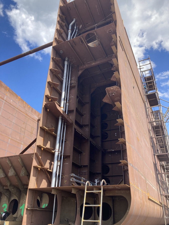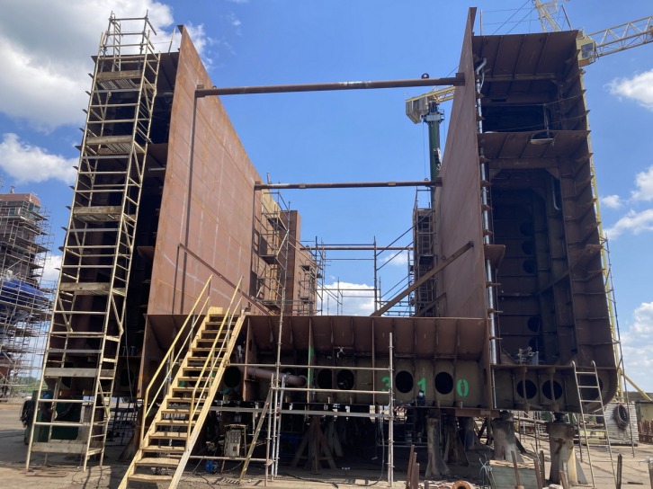 Image by Neptune Marine Further detail on Emerald Duchess' specification: • Forward engine room so the vessel has zero ballast (we don’t use power to transport dead cargo) • Integrated power management system to run stop-start for the three generator sets integrated into the battery hybrid system • Self-charging and shore charging integrated for the battery system • Future fuel agility (HVO, ethanol/methanol) • Vessel has three methods of discharge - bottom door discharge, bow rainbow discharge and low volume discharge to shore (for mud-bank re-charge or discharge to road vehicle) • Through hull access from bow to stern making crew deck access minimised other than mooring • High level of iterative CFD design to minimise the required propulsive power in all load conditions • Engine waste heat recovery and HVAC integration to give least energy possible to provide a comfortable accommodation in all seasonal conditions • Ultrasonic anti-fouling to the cooling systems Images attached provided by Neptune Marine - the construction images were taken w/c 17 July 2023. PD Ports press release