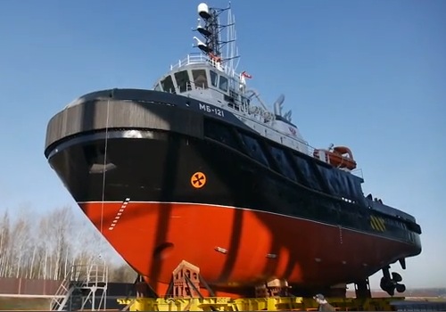 On a driver's special monitor "vessel trolley-transporter" displays information about the distribution of the actual load weight vessel with supports on each trolley for prevent overloading. Before launching "vessel trolley-transporter" shifts the ship with supports on the sphenoid platform, which smoothly moves downward by winches along paths to channel for ship launch positioned at an angle of 3 degrees. When platform submerged into the water the ship breaks the surface. Then the ship moves to building berth. The depth of the channel near the full floats of the vessel is 20 m. At the launching ceremony was attended by representatives of the customer and factory workers, as well as the guest of honor: Captain “MB-121” - Grechukhin Yuriy Borisovich. The vessel was sanctified by Churchman Nikolay of the Church of Alexander Nevsky. Assignment • Multifunctional towing of vessels, floating objects and structures in ice and open water. • Supply of marine objects with equipment and materials, transportation of special staff and cargoes, assistance in technical operations fulfillment at remote sea objects. • Rescue operations, assistance of distressed vessels, search, rescue, evacuation and lodging of people, delivering of medical aid. • Rescue duties in shipping, marine oil and gas recovery areas. • Firefighting operations at floating and shore objects, firefighting of fuel oil burning into water. • Oil and petroleum content products spill removal. • Servicing in transport operations in harbor, shallow and shelf coastal zones. • Maintenance of underwater technical operations. • Breaking of ice with the thickness of up to 1 m at the speed of 2-5 knots. • Escort operations at the speed of up to 10 knots. Class notation: KM Ice2-Arc5 1 AUT1 FF2 WS Supply/Salvage/ Tug by Russian Maritime Register of shipping. Technical information Length overall 48 m Width overall 13 m Draught max 5.4 m Speed 14.5 knots Bollard pull 80 t