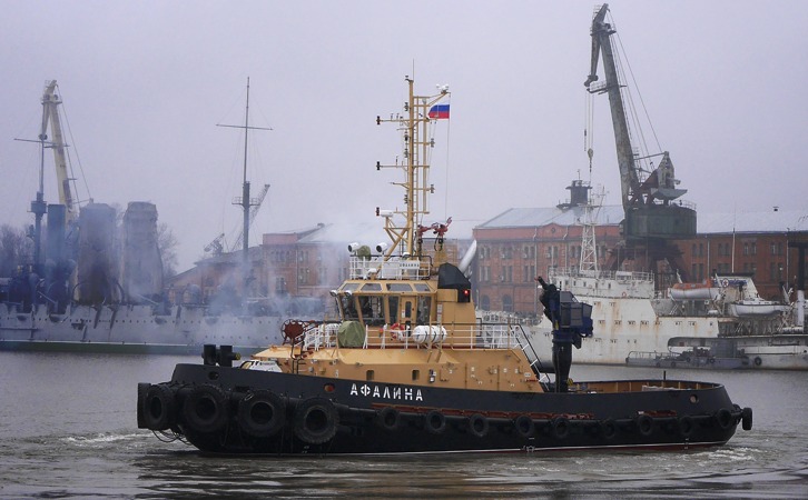 16 November 2015 At the nearest time the tugboat will be delivery to the Customer. Assignment: The tugboat is intended for towing and berthing operations in harbor and coastal areas which comply with R2 navigation area (not more than 100 miles from place of shelter), performing of escort operations at the speed of 10 knots, refloating of ships and vessels, fire fighting operations at floating and shore objects, oil and petroleum content products, cargo transportation, ice breaking and rescue and special purpose operations as well. Technical data: Length, max 28,5 m Width, max 9,5 m Draft 4,3 m Speed ab. 12 knots Bollard pull 47 tones Class notation KM Arc4 R2 Aut1 FF3 WS Tug by Russian Maritime Register of shipping. Propulsion complex Z-drives US 205, Rolls-Royce, FPP into nozzle Power 2x1500 kW at 1600 rpm, Cat 3512B Deck equipment: • 10t bow anchor-towing-mooring winch, Fluidmecanica, providing 1383 kN brakes keeping force; • towing hook SWL 47 t with quick release devise. The tugboat is also equipped with crane-manipulator HM 6/3 S, Fluidmecanica, with the capacity of 910 kg at the boom of 6 m. In order to fulfill fire-fighting operations the tugboat is equipped with external fire fighting system made by FFS (capacity is 800 m3/h, 2 water monitors, water curtains system).