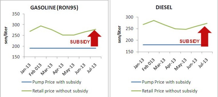 Crude oil has to be processed at petroleum refineries before it can be sold as petroleum products for the consumer consumption. The most commonly known petroleum products are gasoline and diesel. The refineries in Malaysia are generally more complex refineries with the ability to process cheaper sour crude into gasoline and diesel at the same quality required for domestic consumption. It is a common misconception that we are able to produce cheaper petroleum products (gasoline and diesel) if Malaysia were to produce and consume our own crude, as the domestic Tapis blend is the most expensive crude feedstock. This is different to nations such as Saudi Arabia and other Middle East countries thatproduce cheap sour crude in large quantities. As such, by exporting its Tapis blend and importing the lesser quality sour crude for its own domestic consumption, Malaysia has benefitted further by reaping higher value for its crude oil natural resource whilst ensuring energy security for its own domestic consumption. As Malaysia exports and imports different blend of crude simultaneously – similar practice can also be seen in other oil producing nations – we are inevitably susceptible to the changes in global crude oil prices. Over and above the price of crude oil, the petroleum product prices needs to factor in logistics, infrastructure as well processing costs. Despite this, the current retail pump prices of petroleum products in Malaysia does not reflect the real cost of producing the commodity as it does not track and reflect the changes in crude costs. Reason being, the difference and impact of crude changes has been absorbed by heavy government subsidies. As illustrated in Graph 2, crude oil price has been on the upward trend due to geopolitical uncertainties especially in the Middle East such as Syria and Egypt. Despite this, pump price of gasoline and diesel retailing in Malaysia has remained flat, at the expense of a growing subsidy amount. Heavy subsidy is an unsustainable expenditure in the long term. Additionally, it promotes energy inefficiency and imprudent consumption.