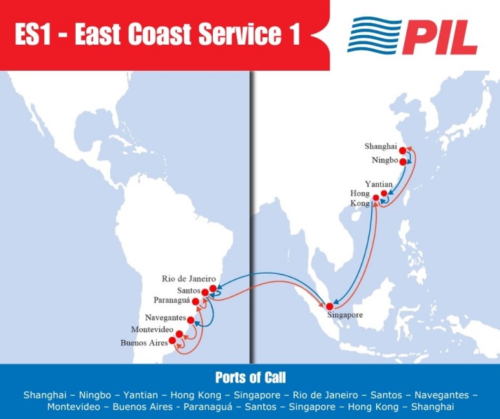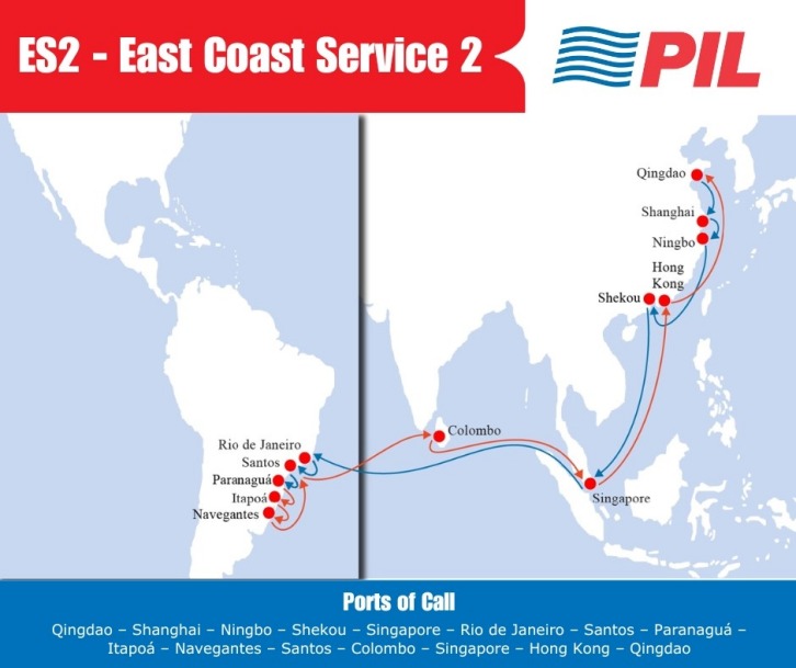 Image by PIL The ports of call for the ES2 service are: ES2: Qingdao -Shanghai - Ningbo - Shekou - Singapore - Rio de Janeiro - Santos - Paranagua - Itapoa - Navegantes - Santos - Colombo - Singapore - Hong Kong - Qingdao