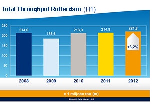 Dry bulk The total amount of dry bulk fell by 8.7% to 39.4 million tonnes. Agribulk (grains, seeds, animal feed ingredients) throughput was down by a tenth to 4.1 million tonnes. Due to increases in the price of products on the world market, customers utilised their stocks. Also, a few packages won from Amsterdam last year were lost again. 12.9 million tonnes of coal (+1.9%) were handled. Despite the declining flow of ores, imports of cokes coal were up, due to the closure of a coke mine in Germany. ThyssenKrupp also focused European coke imports on the EECV terminal. Weak imports of coal for energy in the spring will probably continue in the summer. As a result of the increasing availability of sustainable energy, coal is becoming more season-bound. Demand will probably increase again later in the year. Throughput of ores and scrap fell by 15.1% to 16.4 million tonnes. The production of raw steel is falling due to a decrease in demand as a result of the ailing economy. Utilisation of the blast furnaces in the hinterland is expected to decline this year to 85%. Two steel plants have already closed and Arcelor does not rule out more shutdowns. At ThyssenKrupp, a furnace is being overhauled. Exports of scrap rose in the first half of the year due to the persistently high demand from the Turkish steel industry. Throughput figures for other dry bulk (mainly minerals for the production of glass, paper, steel and chemicals) were 8.8% down at 5.9 million tonnes. Metal-related industry, cars and machinery, in Germany and the Netherlands, and the chemical industry continue to produce at a reasonable level. However, steel production is on the decline and the construction sector remains in a bad way for the time being. In combination with a number of incidental factors, this leads to less demand for minerals and special ores. Liquid bulk The total volume of liquid bulk rose by 10.6% to 107.5 million tonnes. Incoming trade in crude oil was 9.6% up to 50.6 million tonnes, which is at the top end of the historic range. In the past six months, there were no maintenance shutdowns, as compared to two major ones in 2011 . In addition to this, production capacity elsewhere in Europe fell due to the (temporary) closure of refineries. This caused a partial shift of demand for refining capacity to Rotterdam. There was a sharp increase in the handling of mineral oil products, by 13.8% to 39.9 million tonnes. Fuel oil throughput was stimulated by imports from Russia and exports to Singapore due to positive arbitration and the availability of VLCCs. The increase in throughput was facilitated by an increase in the tank capacity at ETT (third phase), STR (more than doubled) and BTT (completely new). Other liquid bulk (basic chemical products, vegetable oils and fats, fruit juices) was 5.6% up to 16.8 million tonnes. This is largely due to the rising throughput figures for palm oil, as a result of such factors as the opening of the plant of Neste Oil. There was also an increase in imports of MTBE and biodiesel, mainly from Asia. However, there was another fall in ethanol imports. General cargo The general cargo sector was treading water at close on 75 million tonnes. Incoming container cargo was down slightly by 0.9%, but there was marked growth of 5% in outgoing trade. Imports from Asia fell due to the stagnating European economy. Exports to Asia and the United States are doing well though, thanks to Chinese demand for quality products and the slight recovery in the American economy. These movements are supported by the lower euro compared to the dollar. Short sea transport increased by 3%, thanks to the Mediterranean region and Scandinavia/Baltic. The British/Irish market is declining. In number of containers, throughput fell by 1.6% to 5.9 million TEU (-92,000) due to the changing import/export ratio with Asia. The number of empty containers leaving the port fell by almost twenty per cent. Roll-on/roll-off transport rose by 0.5% to 8.8 million tonnes. This is not a bad achievement considering the economic shrinkage in England. Given the on-going pressure on prices, continuation of the rationalisation in the sector is likely. Other general cargo had to relinquish most of its gains of the past twelve months: down 24.9% to 3.1 million tonnes. The main cause is the 25% fall in European demand for steel products (sheets, rods, rolls). As a result, fewer ‘slabs’ (tablets of raw steel) were imported from Brazil. There is a lot of movement in non-ferrous metal. Up to now, that is reflected in more storage and inland shipping traffic, thus outside the throughput statistics on the sea side. There was a slight fall in the handling of paper, wood and cellulose. Virtually all fruit now enters Rotterdam in containers. Port of Rotterdam Authority press release |