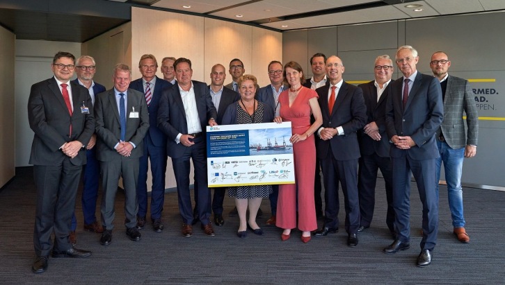 Participants during the Inland Container Shipping Chain sector consultation on 26 September 2018 (from left to right Gerd Deimel (BDI/DSVK), Heiko Brückner (BDB), Joachim Schürings (BDI/DSVK), Theo van Ravesteyn (VRC), Peter den Breejen (VRC), Rob Bagchus (VRTO), Juliën de Jong (FENEX/TLN), Bas Janssen (Deltalinqs), Brigit Gijsbers (Ministry of Infrastructure & Water Management), Paul Goris (CBRB/EBU), Maira van Helvoirt (LINc), Iwan van der Wolf (Portbase), Ronald Paul (Port of Rotterdam Authority), Joost Sitskoorn (evofenedex), Robert Kasteel (CBRB), Co Abercrombie (Koninklijke BLN-Schuttevaer). Image by Port of Rotterdam Authority. Port of Rotterdam Authority press release |