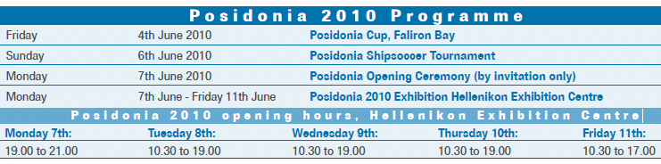 Posidonia 2010 Programme 1,855 companies from 86 countries will take part in Posidonia 2010 at the Hellenikon Exhibition Centre, June 7 to 11. Source: Posidonia Events