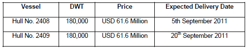 (a) two ship sales contracts (the “Ship Sales Contracts”) with Mitsubishi Corporation, Japan (“Mitsubishi”), for the acquisition (the "Acquisition") of two new 180,000 DWT Capesize Bulk Carriers (Hulls No. 2408 and 2409) (“the New Vessels”) to be built by Hyundai Heavy Industries Co., Ltd., Korea (“HHI“) and