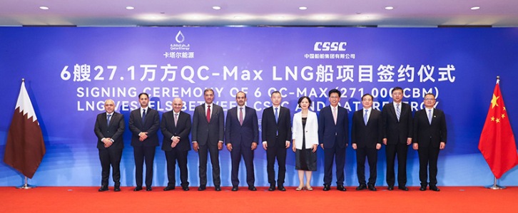 Doha, Qatar - 9 September 2024 QatarEnergy has signed an agreement today with China State Shipbuilding Corporation (CSSC) for the construction of 6 additional state-of-the-art QC-Max vessels, bringing the total number of LNG vessels on order under its fleet expansion program to 128, including 24 QC-Max mega vessels. The QC-Max vessels, which will be built at China's Hudong-Zhonghua Shipyard, a wholly-owned CSSC subsidiary, are the largest LNG vessels ever built with a capacity of 271,000 cubic meters each. The new advanced carriers are scheduled to be delivered between 2028 and 2031. The agreement was signed during a special ceremony held in Shanghai today, by His Excellency Mr. Saad Sherida Al-Kaabi, the Minister of State for Energy Affairs, the President and CEO of QatarEnergy, Mr. Chen Jianliang, the Chairman of Hudong-Zhonghua Shipbuilding (Group) Co. Ltd, and Mr. Hu Kai, the President of China Shipbuilding Trading Co. Ltd. The ceremony was attended by Sheikh Khalid bin Khalifa Al-Thani, the CEO of QatarEnergy LNG, Ms. Jia Haiying, Member of the Party Leadership Group and Chief Financial Officer of China State Shipbuilding Corporation (CSSC), a number of senior Chinese government officials, and senior executives from QatarEnergy, QatarEnergy LNG and CSSC.
