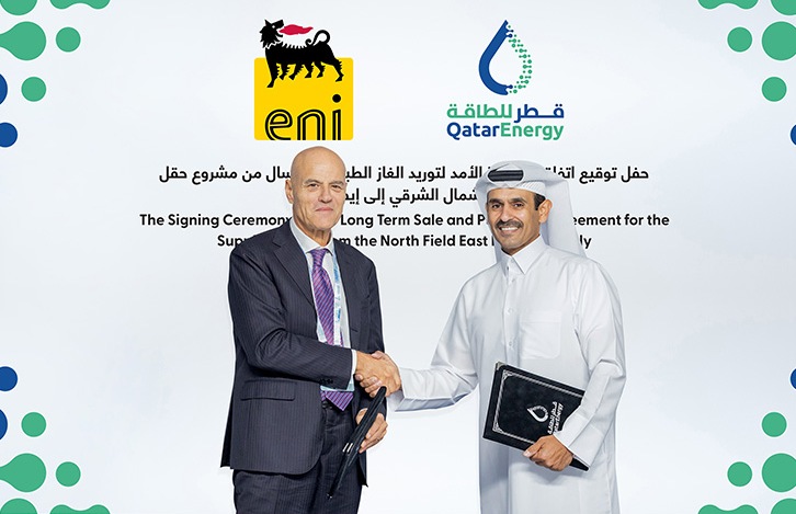 Doha, Qatar - 23 October 2023 Affiliates of QatarEnergy and Eni signed a long-term LNG sale and purchase agreement (SPA) for the supply of up to one million tons per annum (MTPA) of LNG from Qatar to Italy. Pursuant to the SPA, the LNG will be delivered to FSRU Italia, a floating storage and regasification unit, located in the port of Piombino, in Italy's Tuscany region. LNG deliveries are expected to start in 2026 for a term of 27 years and will be sourced from the joint venture between QatarEnergy and Eni that holds an interest in Qatar's North Field East (NFE) expansion project. The SPA was signed by His Excellency Mr. Saad Sherida Al-Kaabi, the Minister of State for Energy Affairs, the President and CEO of QatarEnergy, and Mr. Claudio Descalzi, the CEO of Eni, at a special event held in Doha in the presence of senior executives from both companies. Commenting on this occasion, His Excellency Minister Al-Kaabi said: "Today, we are taking another important step in strengthening our partnership with Eni that will foster our mutual cooperation for many years to come. Our partnership with Eni has borne fruitful results including LNG deliveries through the Fluxys LNG terminal in Belgium's Zeebrugge port and upstream exploration projects in various locations around the world. This agreement further builds on Eni's first entry in the upstream sector in the State of Qatar through our partnership in the historic North Field East expansion project." His Excellency Minister Al-Kaabi added: "Together, we will continue to demonstrate commitment to the European markets in general, and to the Italian market in particular. Since 2009, Qatari LNG has been arriving at the Adriatic LNG terminal in the northern Adriatic to meet more than 10% of Italy's natural gas requirements." Eni is a partner in the 32 MTPA NFE expansion project with a 3.125% share.