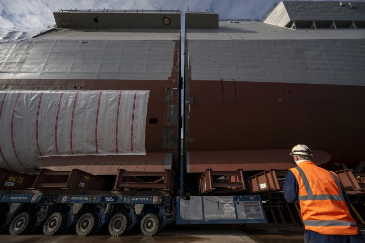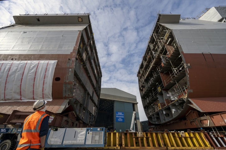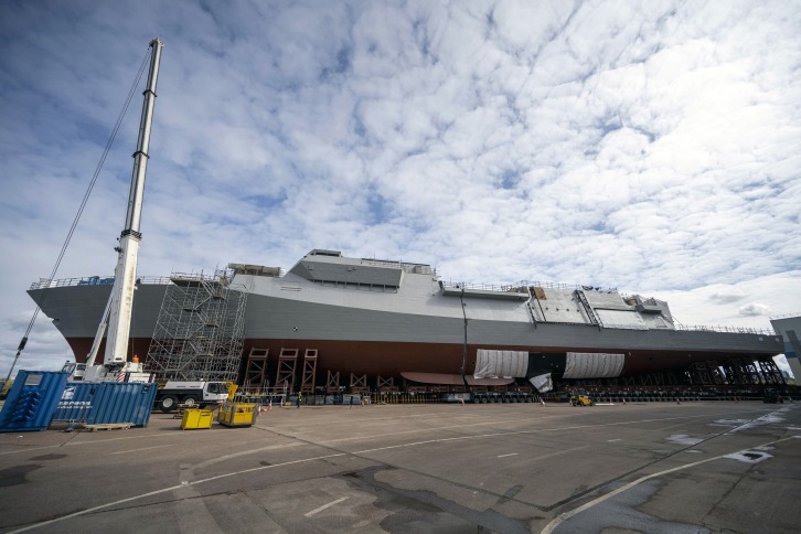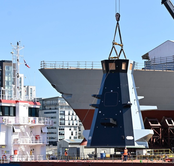 Engineers are about to begin the mammoth task of joining the first of the Navy’s new City class frigates together. 13 May 2021 The two halves of HMS Glasgow are just millimetres apart by the banks of the River Clyde in her namesake city, ready for the complex job of connecting countless systems, pipes, and cables as well as ensuring the hull and structure aligns perfectly. It’s nearly four years since the first steel was cut on the first of the eight future submarine hunters. First the forward block – which contains the bridge, operations room and accommodation spaces – then the after block were carefully moved out of the construction hall at BAE’s Govan yard and on to the adjacent hardstanding. Also waiting to be added to the ship is the main mast – delivered by barge to the shipyard. With the three huge ‘jigsaw pieces’ coming together on the south bank of the Clyde, the scale and scope of the Type 26 programme is now clearly visible. Commodore Stephen Roberts, heading the Type 26 programme for the Royal Navy, hailed the roll-out as a triumph of engineering and effort and an “important milestone in the life of the future HMS Glasgow”. He continued: “I want to take the opportunity to reflect on this huge achievement, most recently against the incredibly challenging backdrop of Covid-19. “Seeing the ship take her form in this way is a tangible representation of the scale of the Type 26 programme and I look forward to witnessing the next phase in the delivery of this advanced anti-submarine warfare capability to the future Royal Navy surface fleet.” HMS Glasgow almost joined at Govan The Type 26s will incorporate some of the weapons and sensors from their predecessors – notably the Artisan radar and Sea Ceptor air defence missile – plus new systems and innovations, including a 5in main gun (instead of the long-standing 4.5in) capable of hitting targets 22 miles away, towed array sensors for anti-submarine warfare and a ‘mission bay’ which can hold whatever is required for a specific mission, such as automated minehunters, drones, and humanitarian aid. At nearly 7,000 tonnes once completed, the City class are considerably larger than the ‘souped up’ anti-submarine warfare Type 23 frigates they will replace. They’re also 17 metres longer (more than 50ft) yet crewed by just 118 sailors – a good 60 fewer than their predecessors.