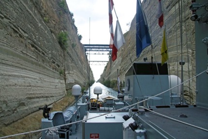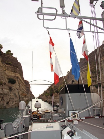 Luckily, Penzance is a mere 10.9 metres (36ft) wide so had loads of room to spare… With tugs on standby, Penzance sailed in pairs with other NATO vessels in Standing Mine Countermeasures Group 2 – Italy’s ITS Alesia and Crotone, Germany’s FGS Rottweil and Turkey’s Erdemli – to reach the Aegean and prepare for her latest exercise of her autumn deployment: Ariadne 13, organised by the Hellenic Navy. The canal passage took about an hour to navigate and was over all too soon for the ship’s company. Penzance’ navigator Lt Dan Owen-Hughes, said: “The Corinth Canal is one of those maritime landmarks that every sailor knows of, so being able to pilot a Royal Navy warship through was definitely a worthy addition to my growing navigation scrapbook. “There was a moment during the approach where you have to reassure yourself that the ship is in fact wide enough for what clearly looks like too narrow a gap in the early stages.” Penzance joined the NATO force in mid-September and will remain with it as it ranges around the Med, exercising and dealing with the detritus of wars past which still litters the seabed, before Portsmouth-based HMS Brocklesby takes over from her in January. Royal Navy press release |