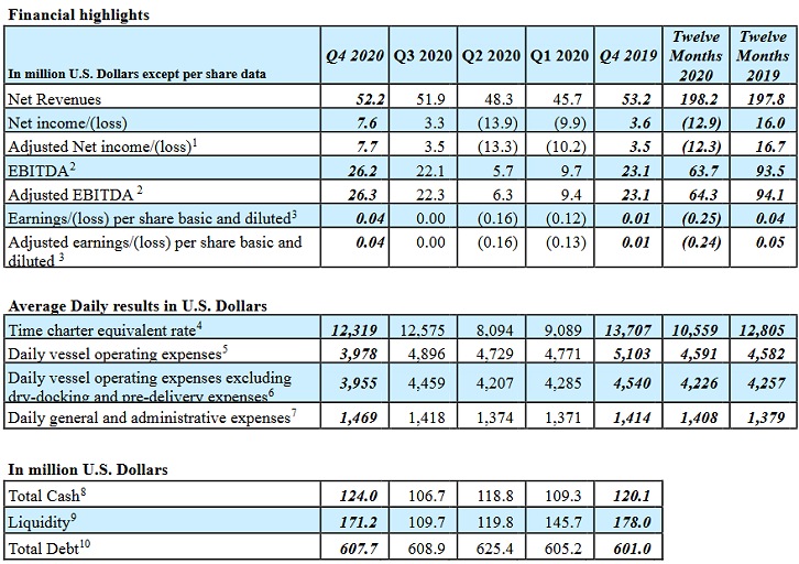 Monaco - February 15, 2021 Safe Bulkers, Inc. (the “Company”) (NYSE: SB), an international provider of marine drybulk transportation services, announced today its unaudited financial results for the three and twelve months period ended December 31, 2020