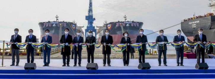 Hyundai Samho Heavy Industries (HSHI) successfully constructed the world's first LNG-fueled large bulk carriers 11 December 2020 HSHI announced that it held a naming ceremony for two 180,000-ton bulk carriers operating on LNG last Friday, December 11, which was attended by Chung Sye-kyun, Korea's Prime Minister; Kim Yung-rok, Governor of Jeollanamdo Province; Seo Myung-deuk, CEO of H-Line Shipping; Chang In-Hwa, President of POSCO; Ka Sam-hyun, Co-CEO of Korea Shipbuilding & Offshore Engineering (KSOE); and Kim Hyung Kwan, CEO of HSHI, among others. The vessels, which mark the first two in a series of four ships of the same design, were dubbed "HL ECO" and "HL GREEN," respectively, which boast great eco-friendliness as the names suggest. With a length of 292m, a breadth of 45m, and a depth of 24.8m, these HSHI-built ships will also become the first large LNG-fueled vessels to travel an international route that covers Korea. The ships are designed to achieve a 99% reduction in emissions of Sulphur oxides (SOx) and particulate matter (PM), respectively, up to 85% in Nitrogen oxides (NOx), and 30% in greenhouse gas (GHG), compared to the levels of the existing ships. Notably, the fuel tanks and hulls are constructed entirely of domestically produced steel. In particular, the LNG fuel tanks boast a 1,600? storage capacity each, the world's largest capacity available for a Type C tank. Each ship is equipped with two of these LNG fuel tanks, which can provide enough energy to heat 3,300 homes for an entire year. The tanks are composed of 9% nickel steel, which exhibits excellent fracture toughness even at cryogenic temperatures required for LNG storage. For stable material supplies and market expansion, HSHI and POSCO worked closely together and succeeded in applying domestically produced 9% nickel steel to ships, which had been traditionally applied only to land-based LNG storage facilities at home, by enhancing the quality of the material to meet the International Maritime Organization's (IMO) tightening standards.