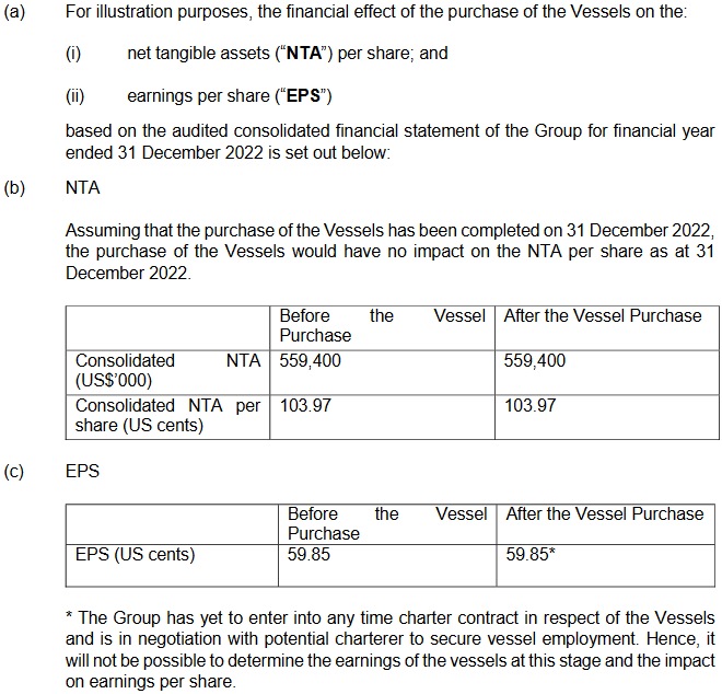 The acquisition of the Vessels is a discloseable transaction pursuant to Chapter 10 of the SGX-ST Listing Manual (the "Listing Manual"). The relative figures for the purchase of the Vessel Purchase computed on the bases set out in Rule 1006 of the Listing Manual and based on the audited consolidated financial statements of the Group for the financial year ended 31 December 2022 are as set out in Annex 1. 2. INFORMATION ABOUT THE VESSELS The Vessels are both Bahama flagged ethylene gas vessels that were built in 2010 and 2009 respectively. The Company will determine the flag of these vessels closer to deliveries. The Vessels will be renamed as Sinar Ternate and Sinar Tidore when the deliveries are completed. 3. TERMS OF THE VESSEL PURCHASE The memorandums of agreement for the Vessels were based on the SALEFORM 2012 (revised 1966, 1983 and 1986/87, 1993 and 2012) prescribed by the Norwegian Shipbrokers' Association for sale and purchase of vessels and adopted by the Baltic and International Maritime Council in 1956 with modification to cater for the specific purchase of the vessels. The memorandums of agreement did not contain any unusual requirements and was consistent with usual market conditions for the sale and purchase of vessel. The acquisition of the Vessels are conditional on each other. 4. PURCHASE PRICE AND BOOK VALUE The aggregate acquisition price for the vessels is US$12,600,000. The book value of the Vessels will be equal to the acquisition price of the Vessels. The purchase considerations were arrived at on a willing-buyer willing-seller basis after taking into account various factors including the price range of comparable vessels provided by the ship broker as well as the age and proposed usage of the vessels. The acquisition will be financed through a combination of internal resources and bank borrowings. 5. FINANCIAL INFORMATION AND EFFECTS