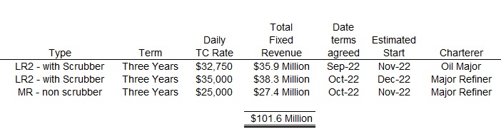 Monaco - Oct. 06, 2022 Scorpio Tankers Inc. (NYSE:STNG) ("Scorpio Tankers," or the "Company") announced today that it has entered into three new time charter-out agreements. Summary of New Time Charters