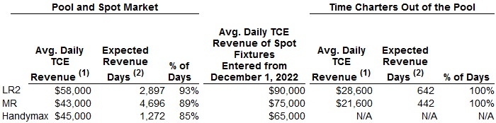 (1) TCE revenue, a Non-IFRS measure, is vessel revenues less voyage expenses (including bunkers and port charges). TCE revenue is included herein because it is a standard shipping industry performance measure used primarily to compare period-to-period changes in a shipping company's performance irrespective of changes in the mix of charter types (i.e., spot charters, time charters, and pool charters), and it provides useful information to investors and management. (2) Expected Revenue Days are the total number of calendar days in the quarter for each vessel, less the total number of expected off-hire days during the period associated with major repairs or drydockings. Consequently, Expected Revenue Days represent the total number of days the vessel is expected to be available to earn revenue. Idle days, which are days when a vessel is available to earn revenue, yet is not employed, are included in revenue days. We use revenue days to show changes in net vessel revenues between periods. Time Charter Out Agreement