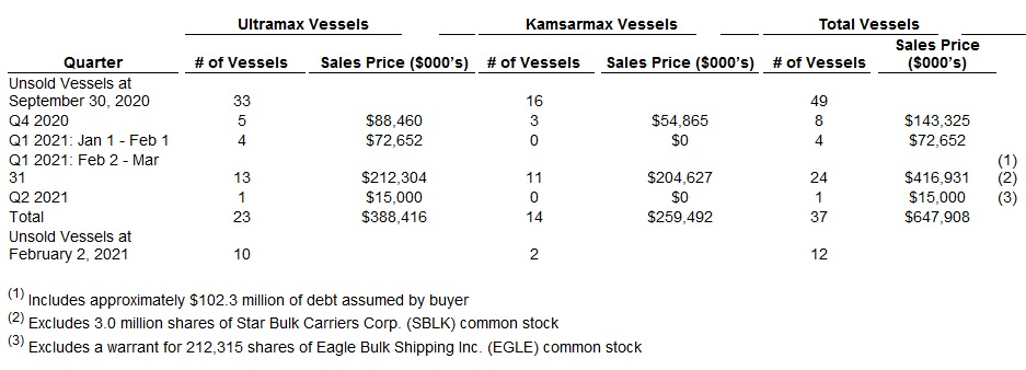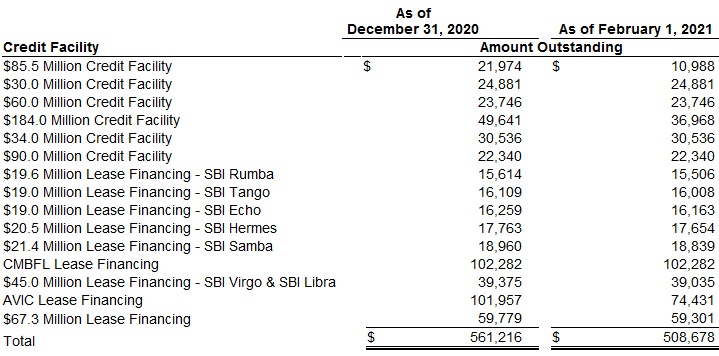 Quarterly Cash Dividend In the fourth quarter of 2020, the Company’s Board of Directors declared and the Company paid a quarterly cash dividend of $0.05 per share totaling approximately $0.6 million. On January 29, 2021, the Company’s Board of Directors declared a quarterly cash dividend of $0.05 per share, payable on or about March 12, 2021, to all shareholders of record as of February 12, 2021. As of February 1, 2021, 11,269,473 shares were outstanding. Share Repurchase Program During the fourth quarter of 2020, the Company repurchased approximately 1.1 million shares of the Company’s common stock, at an average cost of $15.52 per share. The Company subsequently repurchased approximately 41,000 shares of the Company’s common stock at an average cost of $16.96 per share from January 1, 2021 through February 1, 2021. These repurchases, totaling $17.4 million, were made under the Board of Directors authorized share repurchase program and funded from available cash resources. As of February 1, 2021, the Company had $32.6 million authorized remaining available under the authorized share repurchase program. COVID-19 Since the beginning of the calendar year 2020, the ongoing outbreak of the novel coronavirus (COVID-19) that originated in China in December 2019 and that has spread to most developed nations of the world has resulted in numerous actions taken by governments and governmental agencies in an attempt to mitigate the spread of the virus. These measures have resulted in a significant reduction in global economic activity and extreme volatility in the global financial and commodities markets. With respect to our current drybulk operations, a significant reduction in manufacturing and other economic activities has and is expected to continue to have a materially adverse impact on the global demand for raw materials, coal and other bulk cargoes that our customers transport on our vessels. This significant decline in the demand for dry bulk tonnage may materially and adversely impact our ability to profitably charter our vessels. When these measures and the resulting economic impact will end and what the long-term impact of such measures on the global economy will be are not known at this time. As a result, the extent to which COVID-19 will impact the Company’s results of operations and financial condition, including its planned transition towards marine-based renewable energy, will depend on future developments, which are highly uncertain and cannot be predicted. Debt Overview The Company’s outstanding debt balances, gross of unamortized deferred financing costs as of December 31, 2020 and February 1, 2021, are as follows (dollars in thousands):