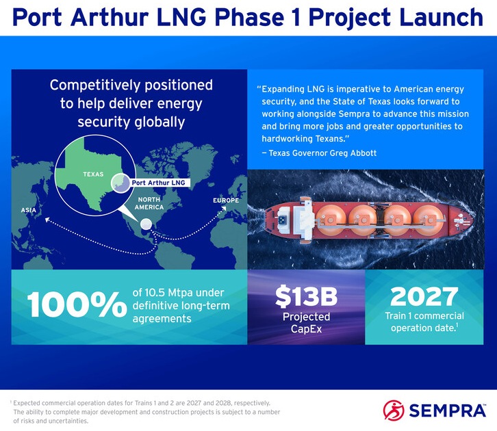 • Finalizes Joint Venture with ConocoPhillips • Closes Non-Recourse Project Financing • Announces Equity Participation by KKR • Issues Final Notice to Proceed to Bechtel San Diego, March 20, 2023 Sempra (NYSE: SRE) (BMV: SRE) today announced that its 70%-owned subsidiary, Sempra Infrastructure Partners, LP (Sempra Infrastructure), reached a positive final investment decision (FID) for the development, construction and operation of the Port Arthur LNG Phase 1 project in Jefferson County, Texas. Sempra Infrastructure closed its joint venture with an affiliate of ConocoPhillips (NYSE: COP), as well as announced an agreement to sell an indirect, non-controlling interest in the project to an infrastructure fund managed by KKR. Additionally, Sempra Infrastructure announced the closing of the project's $6.8 billion non-recourse debt financing and the issuance of the final notice to proceed under the project's engineering, procurement and construction agreement. "At Sempra, we believe bold, forward-looking partnerships will be central to solving the world's energy security and decarbonization challenges," said Jeffrey W. Martin, chairman and chief executive officer of Sempra. "With strong customers, top-tier equity sponsors in ConocoPhillips and KKR and a world class contractor in Bechtel, this project has the potential to become one of America's most significant energy infrastructure investments over time, while creating jobs and spurring continued economic growth across Texas and the Gulf Coast region." "Sempra's selection of Port Arthur as the location for a new natural gas liquefication and export terminal is a strategic decision that will cement Texas' position as the energy capital of the world," said Texas Gov. Greg Abbott. "With a highly skilled workforce and business-friendly climate, and as a national leader in LNG exports, Texas is the prime location to expand LNG operations to unleash the United States' full economic potential in such a critical industry. Expanding LNG is imperative to American energy security, and the State of Texas looks forward to working alongside Sempra to advance this mission and bring more jobs and greater opportunities to hardworking Texans." The Port Arthur LNG Phase 1 project is fully permitted and is designed to include two natural gas liquefaction trains, two liquefied natural gas (LNG) storage tanks and associated facilities with a nameplate capacity of approximately 13 million tonnes per annum (Mtpa). Total capital expenditures for the Port Arthur Phase 1 project are estimated at $13 billion. The long-term contractable capacity of approximately 10.5 Mtpa is fully subscribed under binding long-term agreements with strong counterparties - ConocoPhillips, RWE Supply and Trading, PKN ORLEN S.A., INEOS and ENGIE S.A., all of which became effective upon reaching FID. Sempra Infrastructure is also actively marketing and developing the competitively positioned Port Arthur LNG Phase 2 project, which is expected to have similar offtake capacity to Phase 1.