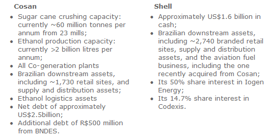 “While there is still plenty of integration planning to do before we launch the proposed joint venture, this is an important milestone in our effort to create one of the world’s most competitive sustainable biofuels companies,” said Rubens Ometto Silveira Mello, Cosan’s Chairman of the Board and non-executive Chairman-elect of the proposed joint venture. With annual production capacity of over 2 billion litres, the proposed joint venture will be one of the world’s largest ethanol producers. The inclusion of Shell’s equity interests in Iogen Energy and Codexis would enable the joint venture to deploy next generation biofuels technologies in the future. The company will also generate electricity from sugar cane bagasse in cogeneration plants at all mills. Ten cogeneration plants are already operational. With total annual sales of about 18 billion litres of fuels, the proposed joint venture will have a competitive position in the Brazilian fuels distribution market built upon a network of about 4,500 retail sites. Today’s agreement follows the signing in February of a non-binding memorandum of understanding. With the transaction terms agreed, Shell and Cosan, which remain as competitors, will now focus on securing regulatory approvals and starting integration planning before launching the new company. The proposed JV would enable Shell and Cosan to establish a scalable and profitable position in sustainable biofuels – one of the most realistic commercial solutions to take carbon out of the transport fuels sector over the next twenty years – by building a highly competitive position in the most efficient ethanol producing country in the world and by exploring opportunities to produce and sell ethanol and sugar globally. Cosan and Shell would contribute the following to the joint venture: