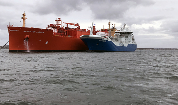 12 Oct 2017 For the first time Skangas’ vessel Coralius both cooled down tanks and delivered liquefied natural gas (LNG) in one operation. The receiving vessel LEG/C Navigator Aurora was supplied with just under 500 mt LNG in the middle of a voyage between Sweden and South Europe. The complete operation took place at Danafjord outside Gothenburg over 7th and 8th of October 2017 and the operation was considered a great success. Combined cooldown and fuel operation Going from using diesel oil to LNG requires a cooling down operation of the receiving ship’s fuel gas tanks from ambient conditions to minus 160 degrees. This operation is time consuming but necessary. The Navigator Aurora’s design allows her to pre-cool her fuel gas tanks before LNG spray is introduced, reducing the cooling down period considerably. All in all, this first bunker operation took less than 24 hours with the transfer of the main parcel taking 6 hours.
