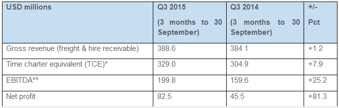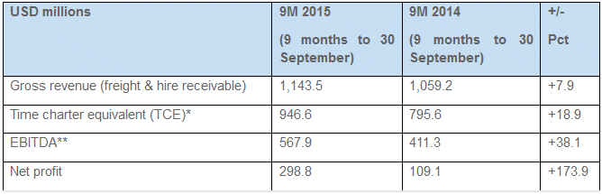 * TCE represents shipping revenues less voyage expenses and is commonly used in the shipping industry to measure financial performance, and to compare revenue generated from a voyage charter to revenue generated from a time charter ** Earnings before interest, tax, amortization and depreciation Nine months 2015 – Financial Highlights (IFRS accounts)