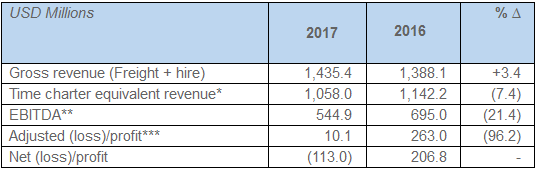 ** Earnings before interest, tax, depreciation and amortisation calculated on an adjusted basis *** Profit before income taxes adjusted for impairment and non-operating income / (expenses) 2017 Market Context and SCF Group Performance 2017 proved to be one of the worst years for the conventional tanker market in the last quarter of a century, with similar conditions experienced to those seen in 2011 and 1992. Conventional tanker freight rates fell by almost 50 per cent year-on-year, reflecting an oversupply of speculative orders following the 2015 market spike, as well as the effect of sustained production cuts by OPEC and other oil producing nations and a backwardation in the oil trade. Set against this background, the Group’s time charter equivalent revenue declined by only 7.4 per cent, demonstrating the robust nature of its industrial-focused business model. Over 2017, the Group continued to implement its strategy to expand the fixed income, industrial shipping segments of its business with Offshore Services and Gas Transportation increasing their revenues by 48.7 per cent and 17.4 per cent respectively. The total share of Group revenue from industrial shipping activities amounted to 51 per cent of its revenue base in 2017, enabling the Group to achieve a positive operating profit for the year. In line with IFRS accounting standards, the Group recorded a non-monetary charge of USD 108 million in total, reflecting impairment of the fleet and non-operating costs regarding litigation in the English courts, relating to various transactions that took place during 2000 - 2004*. Profit before tax, when adjusted for the impairment reserve of the fleet and non-operating costs, amounted to USD 10.1 million in 2017, signifying that the Group remained profitable at an operating level despite the severe market conditions affecting its conventional fleet. 2017 Operating Highlights A highly specialised icebreaking platform supply vessel (IBSV) Gennadiy Nevelskoy was delivered in March. This was followed in June by Stepan Makarov, and Fedor Ushakov in October, the first three in a series of four multifunctional ice-breaking supply and standby vessels. All vessels are contracted to operate on the Sakhalin-2 -Project, under 20-year time-charters to Sakhalin Energy Investment Company. • The world’s first ice-breaking LNG carrier, Christophe de Margerie (Arc7 class, 172,600m3 cargo capacity), was delivered into long-term time-charter with Yamal LNG. In August, she successfully completed her first commercial voyage, transporting LNG through the Northern Sea Route (NSR) from Norway to South Korea, becoming the world’s first merchant vessel to travel the full length of the NSR without an icebreaker escort. The vessel commenced loadings from Sabetta following the official launch of the Yamal LNG plant in December 2017. • In April the Group announced an agreement with Shell for the supply of liquefied natural gas (LNG) to fuel the first of a new generation of gas powered Aframax crude oil tankers. Sovcomflot will take delivery of six such ice-class vessels (114,000 tonnes DWT, Ice 1A) over Q3 2018-Q1 2019. • Completion of a series of refinancing deals amounting to USD 367 million, including a USD 150 million bond issue and a USD 174 million long-term facility with Sberbank for the Prirazlomnoe Project vessels and a USD 43 million refinancing with Unicredit and Nordea. • Contracted future revenues stood at USD 8.1 billion as at 31 December 2017. • On 16 April, the Group and the Admiral Nevelskoy Maritime State University (MSUN, Vladivostok) signed an agreement to establish a joint educational and research project entitled the “Floating Laboratory” to be based aboard Gennadiy Nevelskoy. The agreement is the latest chapter in a long-term cooperation programme between Sovcomflot and the University. • The Group has received a number of industry awards and notations including Seatrade’s ‘Deal of the Year’ award for its USD 750 million 7-year Eurobond offering, Lloyd’s List’s ‘Tanker Operator of the Year’ award and Platts Global Energy Award in the ‘Engineering Project of the Year’ category. Sergey Frank, President and CEO of Sovcomflot commented: “Despite the very strong headwinds seen in the conventional tanker markets over 2017, with freight rates down by almost 50 per cent reflecting one of the worst years in a quarter of a century, we continued to implement our core strategy of industrialising our business model. Sovcomflot’s growing industrial portfolio (offshore services and gas transportation) enabled us to remain profitable operationally. Our Offshore and Gas businesses saw time charter equivalent revenues increasing by 48.7 and 17.4 per cent respectively year-on-year, providing a welcome relief from the difficult conditions facing our conventional tankers. The robust nature of the Group’s business model has shown our ability to weather the low point of the shipping cycle”. “In such a challenging year, I am especially grateful to all my colleagues at sea and ashore for their continued professionalism and dedication, and to our clients and partners around the world for their valued support. It’s especially important that, in this extremely challenging year, we continued our commitment to innovation by delivering to our clients some of the most advanced vessels ever constructed, which will contribute to their upstream projects and address some unique operational challenges in the harsh environments. Further, we achieved a significant milestone with the decision to power with LNG our new generation of ice class Aframax tankers, setting new standards for emissions and making the tanker industry greener”. Evgeniy Ambrosov, Senior Executive Vice-President of Sovcomflot, commented: “Last year we have delivered several pioneering new vessels, designed in close cooperation with our esteemed strategic charterers, which are destined to become one of the core ele