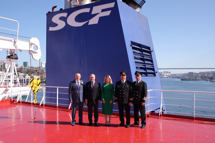 Pictured, from left to right: Oleg Melnikov, Vice-Governor of Primorsky Region; Sergey Frank, Chairman of the Board of Directors of Sovcomflot; Oksana Tarasenko, Deputy Minister of Economic Development of Russia and the vessel’s sponsor; Dmitry Kravchenko, the ship's master; Yury Malyshev, CEO of SCF Arctic, an SCF Group subsidiary that operates the Group's Arctic vessels. Image by SCF Group. Sovcomflot (SCF Group) is one of the world's leading energy shipping companies, specialising in the transportation of crude oil, petroleum products, and liquefied gas, as well as the servicing of offshore oil and gas exploration and production. The company’s fleet includes 147 vessels with a total deadweight of over 12.8 million tonnes. More than 80 vessels have an ice class. Sovcomflot is involved in servicing large oil and gas projects in Russia and around the world: Sakhalin-1; Sakhalin-2; Varandey; Prirazlomnoye; Novy Port; Yamal LNG, and Tangguh (Indonesia). The company is headquartered in Saint Petersburg, with offices in Moscow, Novorossiysk, Murmansk, Vladivostok, Yuzhno-Sakhalinsk, London, Limassol, and Dubai. SCF Group press release.