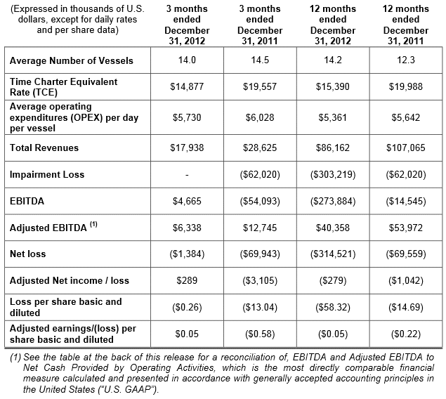 Star Bulk Carriers Corp. (the "Company" or "Star Bulk") (Nasdaq: SBLK), a global shipping company focusing on the transportation of dry bulk cargoes, today announced its unaudited financial and operating results for the three and the twelve months ended December 31, 2012.
