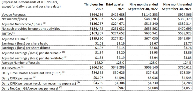 Amounts shown throughout the press release and variations in period–on–period comparisons are derived from the actual unaudited numbers in our books and records. Reference to per share figures below are based on 102,541,314 and 102,525,065 weighted average diluted shares for the third quarter of 2022 and 2021, respectively. Third Quarter 2022 and 2021 Results For the third quarter of 2022, we had a net income of $109.7 million, or $1.07 earnings per share, compared to a net income for the third quarter of 2021 of $220.4 million, or $2.15 earnings per share. Adjusted net income, which excludes certain non-cash items, was $136.3 million, or $1.33 earnings per share, for the third quarter of 2022, compared to an adjusted net income of $224.7 million for the third quarter of 2021, or $2.19 earnings per share. Net cash provided by operating activities for the third quarter of 2022 was $184.5 million, compared to $251.0 million for the third quarter of 2021. Adjusted EBITDA, which excludes certain non-cash items, was $189.9 million for the third quarter of 2022, compared to $277.8 million for the third quarter of 2021. Voyage revenues for the third quarter of 2022 decreased to $364.1 million from $415.7 million in the third quarter of 2021 and Time charter equivalent revenues ("TCE Revenues")1 were $266.7 million for the third quarter of 2022, compared to $349.3 million for the third quarter of 2021. TCE rate for the third quarter of 2022 was $24,365 compared to $30,626 for the third quarter of 2021 which is indicative of the weaker market conditions prevailing during the recent quarter. Our results for the third quarter of 2022 include a loss on write-down of inventories of $14.9 million resulting from the valuation of the bunkers remaining on board our vessels following the substantial decrease of bunkers’ net realizable value compared to their historical cost. For the third quarters of 2022 and 2021, vessel operating expenses were $60.1 million and $54.1 million, respectively. Vessel operating expenses for the third quarter of 2022 included additional crew expenses related to the increased number and cost of crew changes performed during the period as a result of COVID-19 related restrictions, estimated to be $1.9 million. In addition, during the third quarter of 2022 we incurred $2.1 million of additional operating expenses due to change of management of certain vessels from third party to in-house. Vessel operating expenses for the third quarter of 2021 included COVID-19 related expenses of $2.8 million and pre-delivery and pre-joining expenses of $0.6 million. Excluding non-recurring expenses such as increased costs due to the COVID-19 pandemic, exceptional operating expenses due to change of management and pre-delivery and pre-joining expenses, our daily operating expenses per vessel for the third quarters of 2022 and 2021 were $4,769 and $4,304, respectively. This increase was driven by the higher repair and maintenance costs incurred due to the preventive maintenance program of our fleet, ensuring quality service to our clients and minimizing off hire time, as well as inflationary pressure on the cost of materials and services worldwide. Drydocking expenses for the third quarter of 2022 and 2021, were $9.8 million and $5.1 million, respectively.During the third quarter of 2022 8 vessels, mainly Newcatlemaxes and Capesizes, completed their periodic dry docking surveys while during the corresponding period in 2021, 6 vessels, mainly Supramaxes, completed their periodic dry docking surveys. General and administrative expenses for the third quarters of 2022 and 2021 were $18.4 million and $12.8 million, respectively, primarily due to the increase in the stock based compensation expense to $11.9 million from $6.1 million. Vessel management fees for the third quarters of 2022 and 2021 were $4.9 million. Our daily net cash general and administrative expenses per vessel (including management fees and excluding share-based compensation and other non-cash charges) for the third quarters of 2022 and 2021 were $950 and $987, respectively. Interest and finance costs for the third quarters of 2022 and 2021 were $13.4 million and $13.8 million, respectively. The driving factor for this variation is the decrease of the weighted average outstanding indebtedness, which was partly offset by the increase in Libor rates. We incurred interest and other income of $0.2 million in the third quarter of 2022 and interest and other loss of $1.0 million in the third quarter of 2021. This variation is mainly due to higher interest earned from fixed deposits during the third quarter of 2022 compared to that earned in the corresponding period in 2021, counterbalanced by the higher exchange losses in the third quarter of 2022. Full report About Star Bulk Star Bulk is a global shipping company providing worldwide seaborne transportation solutions in the dry bulk sector. Star Bulk’s vessels transport major bulks, which include iron ore, minerals and grain, and minor bulks, which include bauxite, fertilizers and steel products. Star Bulk was incorporated in the Marshall Islands on December 13, 2006 and maintains executive offices in Athens, New York, Limassol, Singapore and Germany. Its common stock trades on the Nasdaq Global Select Market under the symbol "SBLK". Star Bulk operates a fleet of 128 vessels, with an aggregate capacity of 14.1 million dwt, consisting of 17 Newcastlemax, 22 Capesize, 2 Mini Capesize, 7 Post Panamax, 41 Kamsarmax, 2 Panamax, 20 Ultramax and 17 Supramax vessels with carrying capacities between 52,425 dwt and 209,529 dwt. Star Bulk Carriers Corp. press release