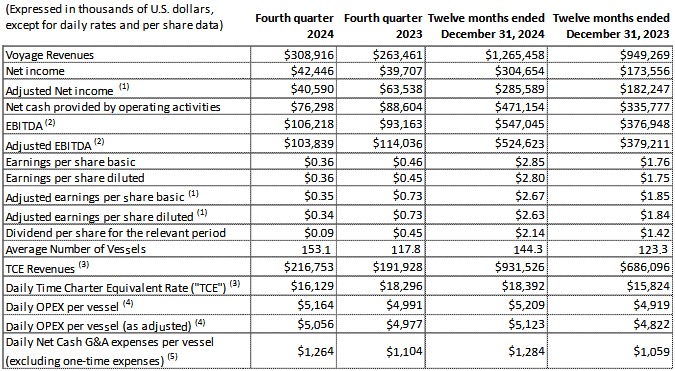 (2) EBITDA and Adjusted EBITDA are non-GAAP liquidity measures. Please see EXHIBIT I at the end of this release for a reconciliation of EBITDA and Adjusted EBITDA to Net Cash Provided by / (Used in) Operating Activities, which is the most directly comparable financial measure calculated and presented in accordance with U.S. GAAP, as well as for the definition of each measure. To derive Adjusted EBITDA from EBITDA, we exclude certain non-cash gains / (losses) and one-time expenses. (3) Daily Time Charter Equivalent Rate ("TCE") and TCE Revenues are non-GAAP measures. Please see EXHIBIT I at the end of this release for a reconciliation to Voyage Revenues, which is the most directly comparable financial measure calculated and presented in accordance with U.S. GAAP. The definition of each measure is provided in footnote (7) to the Summary of Selected Data table below. (4) Daily OPEX per vessel is calculated by dividing vessel operating expenses by Ownership days (defined below). Daily OPEX per vessel (as adjusted) is calculated by dividing vessel operating expenses excluding increased costs due to the COVID-19 pandemic or pre-delivery expenses for each vessel on acquisition or change of management, if any, by Ownership days. In the future we may incur expenses that are the same as or similar to certain expenses (as described above) that were previously excluded. (5) Daily Net Cash G&A expenses per vessel is calculated by (1) adding the Management fee expense to the General and Administrative expenses, net of share-based compensation expense and other non-cash charges and one-time expenses and (2) then dividing the result by the sum of Ownership days and Charter-in days (defined below). Please see EXHIBIT I at the end of this release for a reconciliation to General and administrative expenses, which is the most directly comparable financial measure calculated and presented in accordance with U.S. GAAP. Petros Pappas, Chief Executive Officer of Star Bulk, commented: "Star Bulk reported for the fourth quarter of 2024 Net Income of $42.4 million, TCE Revenues of $216.8 million and EBITDA of $106.2 million. Recently, we announced an amended dividend policy alongside a new $100.0 million share repurchase authorization. Under this policy, the Company may allocate up to 60% of excess cash flow towards dividends, with the remainder reserved for opportunistic share buybacks, growth initiatives and fleet renewal. For this quarter, excess cash flow amounted to $17.6 million. Our Board of Directors has approved a dividend distribution of $0.09 per share, and we spent over $7.4 million to repurchase 500,000 shares in January. Overall, we have repurchased approximately 900,000 shares since the renewal of our share repurchase program. On the operational front, we have made significant progress in integrating systems and processes, creating a best-in-class ship-owning and management platform that combines the strengths of both Star Bulk and ex-Eagle Bulk. Delivering on our commitment to synergies, we have cumulatively reduced costs by $21.8 million since April 2024. Notably, this quarter alone, we achieved $12.6 million in cost reductions—equivalent to an annualized run rate of over $50.0 million—an important milestone reached ahead of schedule. From a financing perspective, we continue to benefit from strong interest by major financial institutions in lending to Star Bulk. We have successfully raised new debt and refinanced existing facilities on highly attractive terms, reducing costs while extending maturities. As environmental regulations become increasingly stringent, Star Bulk continues to invest in technology, expertise and personnel both to comply with new EU environmental regulations and prepare for upcoming global mandates. Looking ahead, while the first quarter is traditionally weaker and geopolitical uncertainties persist, we remain cautiously optimistic about the medium-term outlook for the dry bulk market. The orderbook remains low, with limited incentive for new vessel orders given current pricing and market conditions, despite an aging global fleet. With our strong balance sheet, scale, and deep industry expertise, Star Bulk is well positioned to capitalize on future opportunities and continue delivering value to our shareholders." Recent Developments Declaration of Dividend On February 18, 2025, pursuant to our dividend policy, as amended and announced on December 16, 2024 (our "Dividend Policy"), our Board of Directors declared a quarterly cash dividend of $0.09 per share (corresponding to 60% of the "Cash Flow"1 of the fourth quarter of 2024), payable on or about March 18, 2025 to all shareholders of record as of March 4, 2025. Pursuant to our Dividend Policy, the remaining 40% of the "Cash Flow" of the fourth quarter 2024, has been used to buy back shares as described in the below paragraph. Share Repurchase Program & Shares Outstanding Update On December 13, 2024, our Board of Directors cancelled the existing $50.0 million share repurchase program and authorized a new share repurchase program of up to an aggregate of $100.0 million ("New Share Repurchase Program") on the same terms and conditions as the previous share repurchase program. Pursuant to the New Share Repurchase Program and using proceeds from previous vessel sales as well as 40% of the "Cash Flow" of the fourth quarter of 2024 (pursuant to our Dividend Policy), in December 2024 and January 2025, we repurchased 393,474 and 500,000 common shares, respectively, in open market transactions at an average price of $15.08 per share for an aggregate consideration of $13.5 million. As of the date of this release, we have 117,127,531 shares outstanding and $86.5 million outstanding under our New Share Repurchase Program. Fleet Update Vessels' S&P In connection with the previously announced vessel sales, the vessels Star Hydrus, Imperial Eagle and Diva were delivered to their new owners on November 21, 2024, November 27, 2024 and D